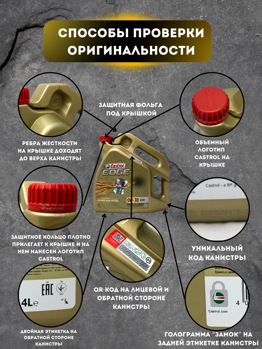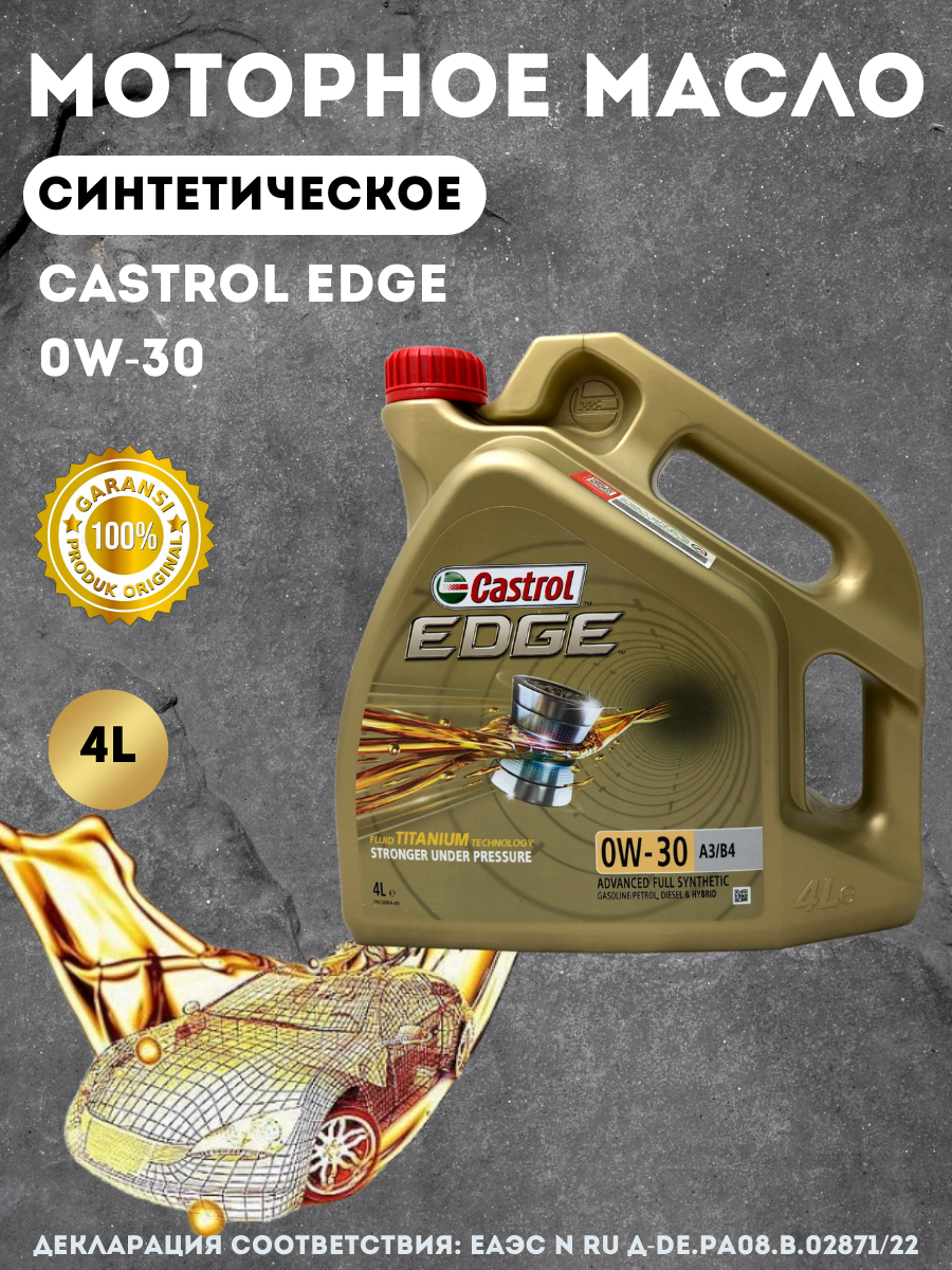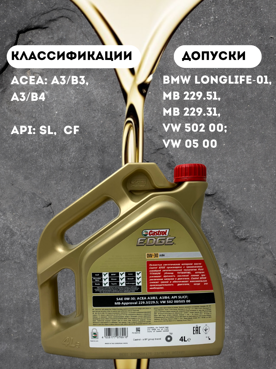 Castrol EDGE 0W-30 A3/B4 - полностью синтетическое моторное масло, произведенное с использованием новейшей технологии TITANIUM FST™, придающей масляной пленке дополнительную силу и прочность, благодаря соединениям титана. Моторное масло Castrol EDGE 0W-30 A3/B4 позволяет полностью высвободить потенциал двигателя Вашего автомобиля, используя новейшие современные технологии. Высокая экономия топлива и защита от износа обеспечиваются на протяжении всего срока службы.