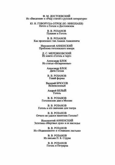 Гоголевская критика за 200 лет огромна. В антологию "Гоголь в русской критике" вошел лишь отборный состав статей от Пушкина и Белинского до лучшего в наши дни - 38 имен: Пушкин, В. Г. Белинский, С. Т. и И. С. Аксаковы, П. А. Вяземский, Ал. Григорьев, арх. Феодор (А. М. Бухарев), Ф. М. Достоевский, В. В. Розанов, Д. С. Мережковский, А. Блок, А. Белый, И. Анненский, В. Брюсов, Б. М. Эйхенбаум, Вяч. Иванов, М. Бахтин, В. Набоков, С. М. Эйзенштейн, А. Терц, Ю. Лотман и ряд лучших имен последнего сорокалетия.