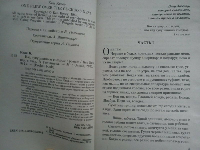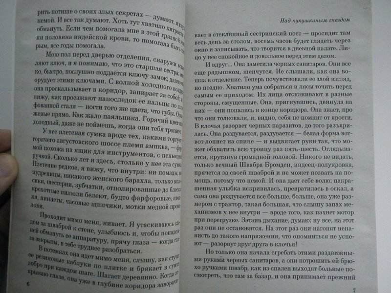 Сначала удивило название, подумал, что попался недобросовестный переводчик, ан нет, название книги звучит именно так: "Над кукушкиным гнездом". Что самое интересное, тема названия ни разу не раскрывается в произведении. Так что решать, при чем тут кукушки, кукушата, гнезда и полеты - именно нам, читателям. -