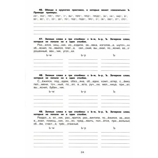 Отличная книга предназначенная как для самостоятельной работы ученика дома, так и для занятий в классе. Качество бумаги отличное, шрифт крупный, что выгодно отличает это пособие от других подобных. Может использоваться и родителями, НО если они в состоянии проверить то, что сделал ребёнок(ответов в книге нет). Упражнения подобраны систематизированно, т.е. по темам, а не в разбивку. Это может очень помочь в самостоятельной работе, если ребёнок что-то плохо усвоил.