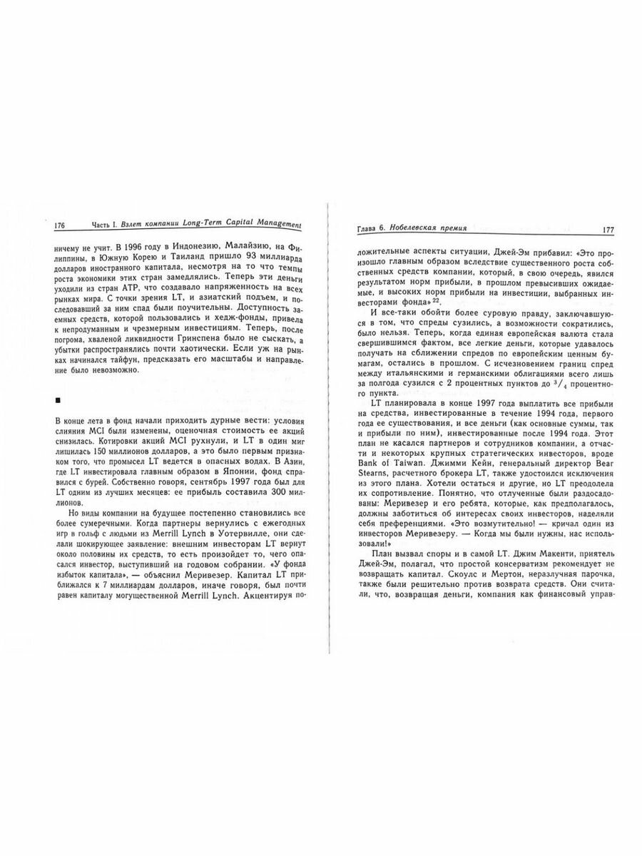 Вместе с "Покером лжецов" Майкла Льюиса эта книга составляет своеобразную дилогию. Одни найдут в ней документальную историю взлета и падения созданной по образцу и подобию инвестиционного банка Salomon Brothers компании LTCM, описание и анализ ее деятельности. Другие усмотрят интерпретацию вечного сюжета о конфликте разума и азарта, о несовпадении благих намерений одних с алчными интересами других. Перед нами увлекательный рассказ о недавней попытке группы ученых и нобелевских лауреатов применить глубоко рациональный закон больших чисел на рынке облигаций, но вместе с тем - притча о человеческих страстях и пороках. Один нюанс этой истории будет особенно любопытен российскому читателю: августовский дефолт 1998 года в России, оказавшийся непредсказуемым и непостижимым даже для лауреатов Нобелевской премии.