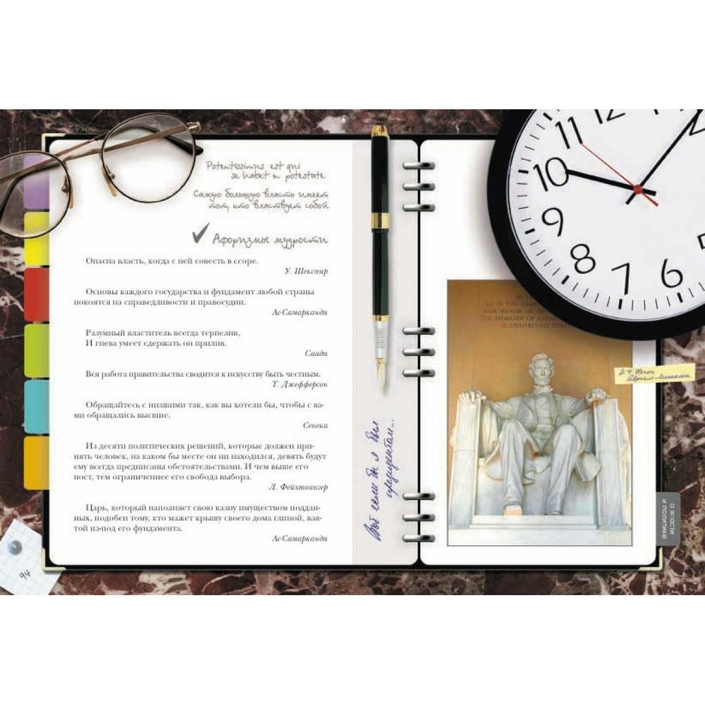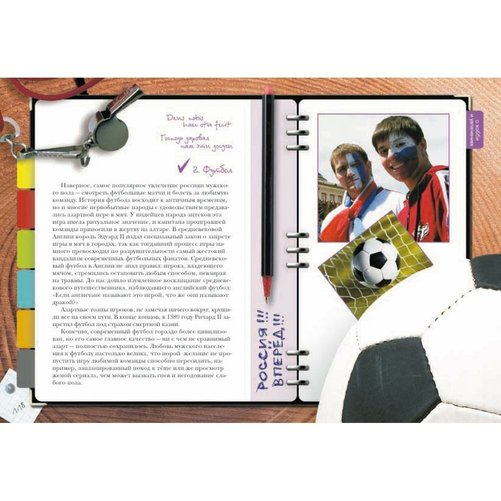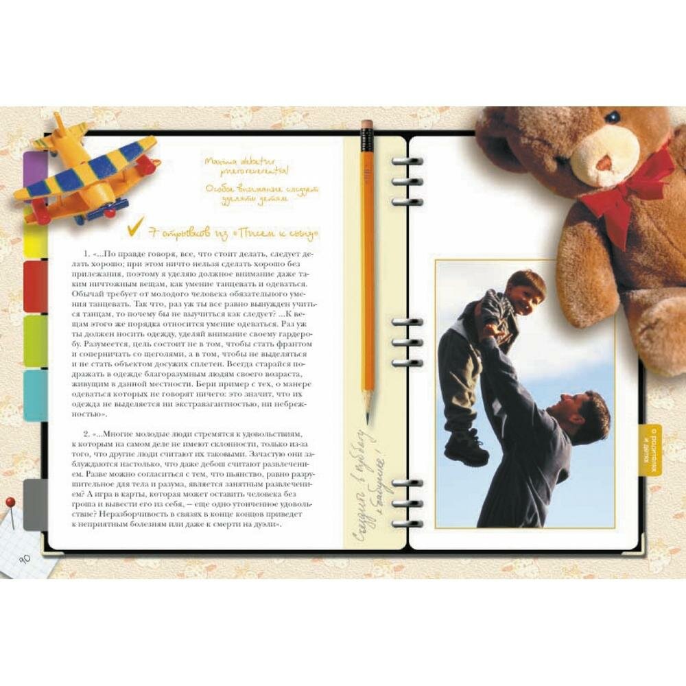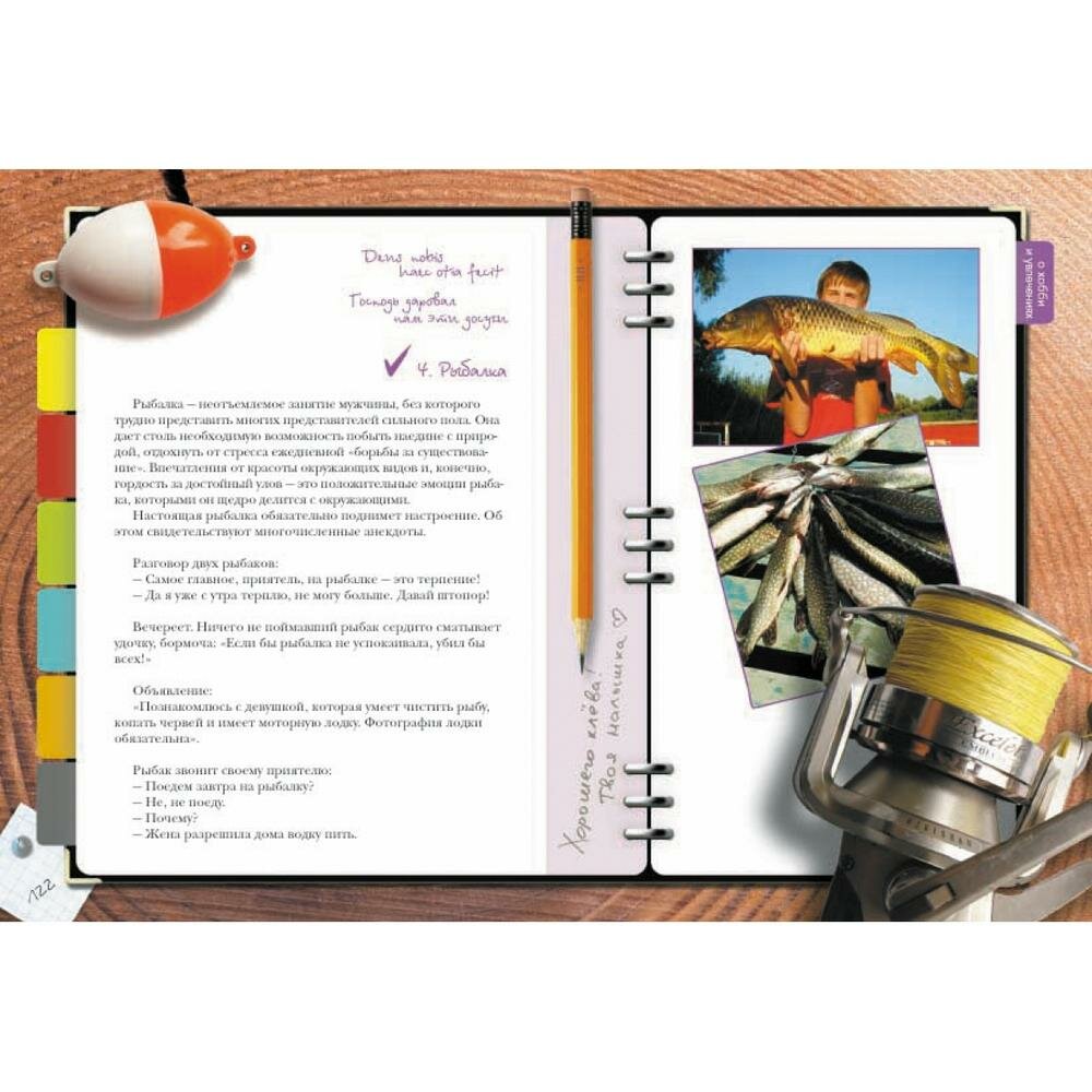 и для всех:"О характере и привычках". Так что конечно,книга вроде бы и универсальна для всех возрастов,но что-то "в супе не хватает",не совсем четко продумано решение,лучше бы не пытаться охватить всех,а подразделить на тинейджеров и зрелых мужей. А в целом держать в руках и листать книжку приятно. Удобный формат, глянцевые странички, афоризмы на все случаи жизни,удачный подбор иллюстраций.Единственно не понравилась заставка в блоке "Увлечения"-фото руки гончара(это что самое популярное нынче хобби?),а так даже фото действующего президента с премьером есть(в блоке "Политика")-все очень актуально.