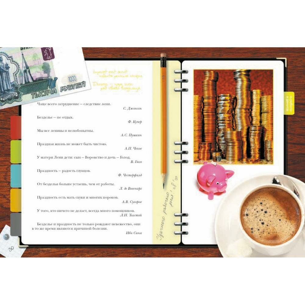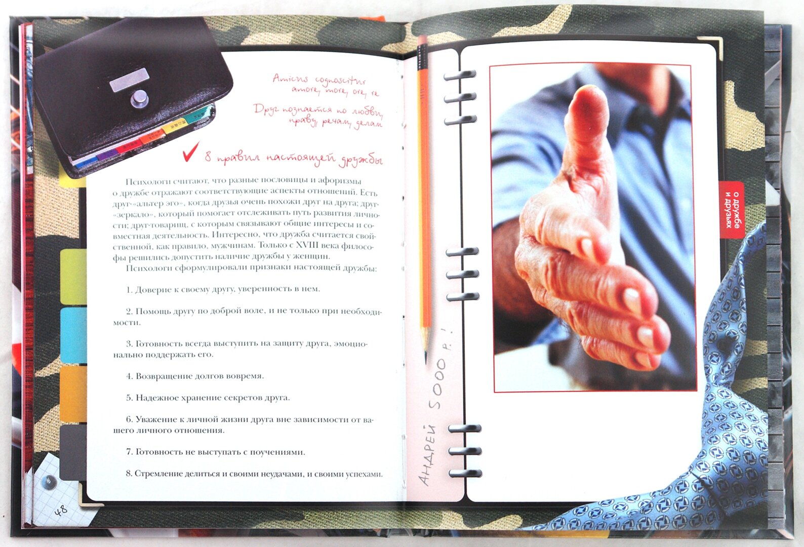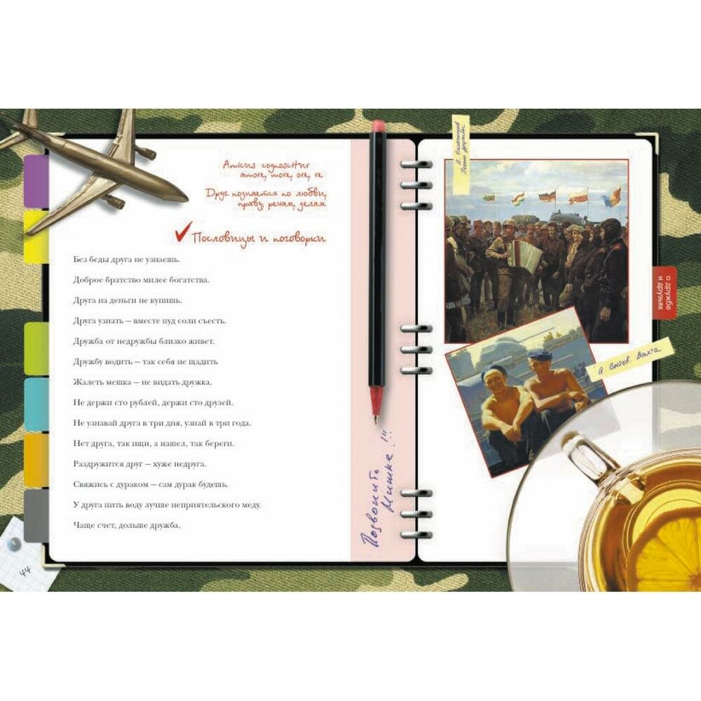 и для всех:"О характере и привычках". Так что конечно,книга вроде бы и универсальна для всех возрастов,но что-то "в супе не хватает",не совсем четко продумано решение,лучше бы не пытаться охватить всех,а подразделить на тинейджеров и зрелых мужей. А в целом держать в руках и листать книжку приятно. Удобный формат, глянцевые странички, афоризмы на все случаи жизни,удачный подбор иллюстраций.Единственно не понравилась заставка в блоке "Увлечения"-фото руки гончара(это что самое популярное нынче хобби?),а так даже фото действующего президента с премьером есть(в блоке "Политика")-все очень актуально.
