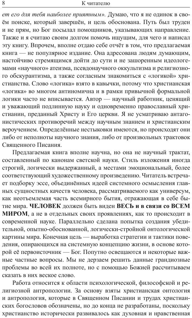 Книга посвящена проблемам психологической, философской и христианской религиозной антропологии. Представлена авторская концепция всемирного бытия и человека в нем, в контексте которой рассмотрены некоторые важные аспекты социальной и индивидуально-личностной жизни людей. Отдельные идеи заимствованы, иные - сугубо авторские, но все они интегрированы в единую мировоззренческую систему, опирающуюся на христианское вероучение. Прикладная сторона произведения - это ясно выраженная, целесообразная с точки зрения предложенной концепции стратегия жизни человека.
