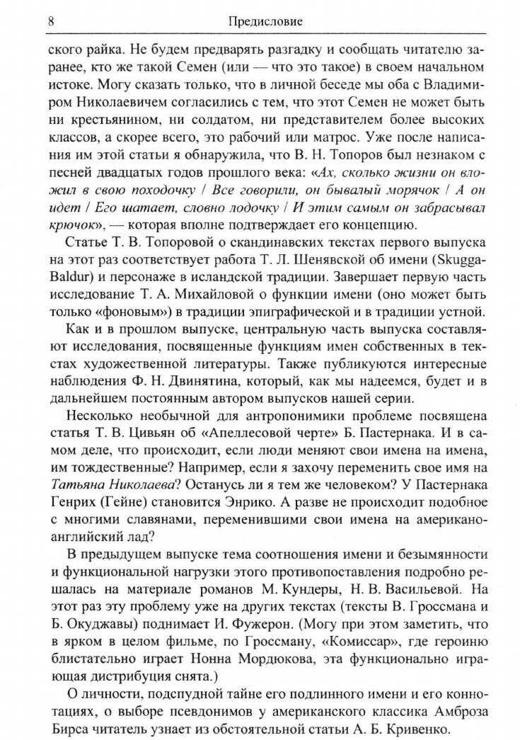 Сборник "Семантика имени" (Имя-2) отражает традиции анализа имен собственных в тексте в Московской семиотической школе. Древнейшие тексты анализируются в работах Вяч. Вс. Иванова и В. Н. Топорова. Вводится и скандинавская линия (Т. Л. Шенявская, Т. А. Михайлова). Имена в текстах XX века описываются и "разгады-ваются" в статьях Т. В. Цивьян, Е. А. Вельмезовой, И. Фужерон. В сборник вошли и описания игры именами в заговорных текстах и мемуарной прозе. Впервые ставится вопрос о возможном прототипе Федьки Басманова в фильме "Иван Грозный".