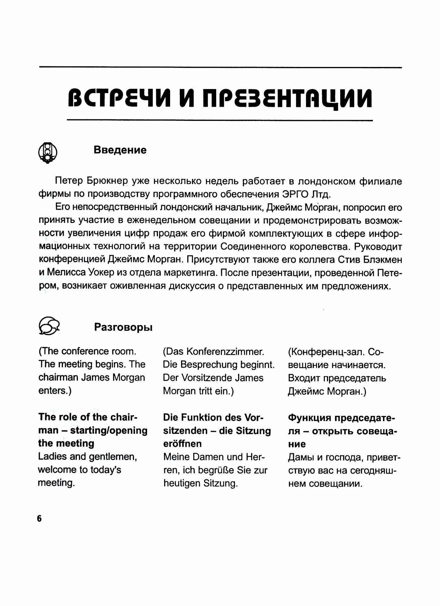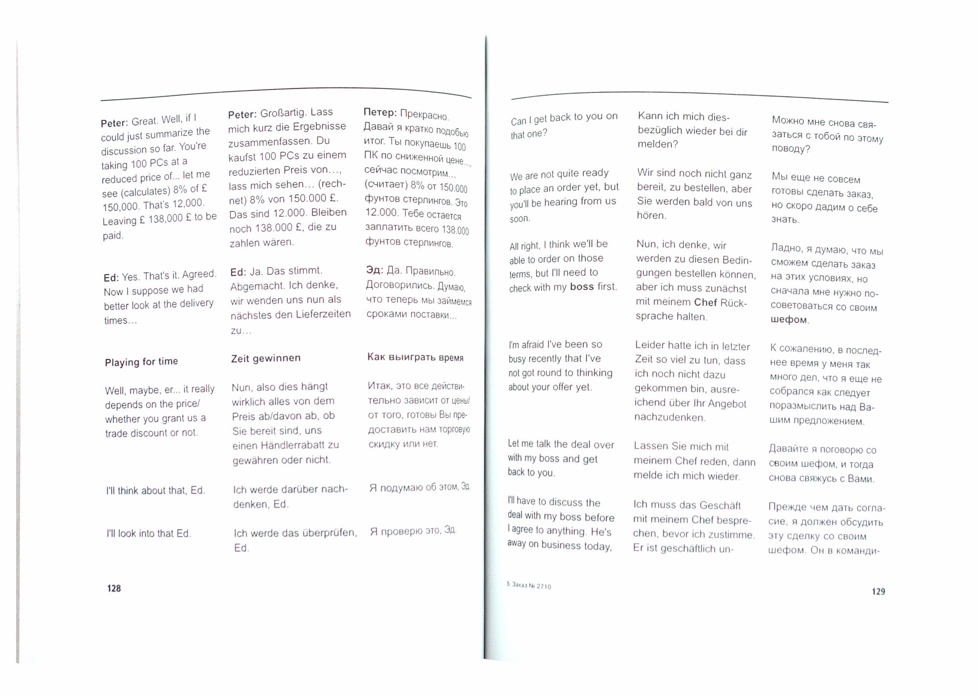 Этот инновационный трехъязычный разговорник включил в себя все аспекты ведения успешных переговоров, заключение сделок, традиции и базовый курс выражений, применяемых в бизнесе.