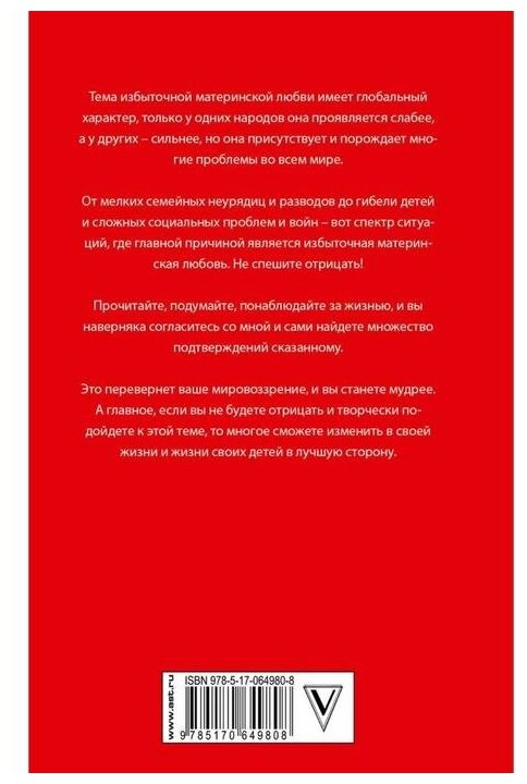Рассматривается та сторона материнской любви, которая исподволь приносит множество страданий и горя родителям, детям и обществу в целом. Исследований такой глубины на эту тему в литературе ещё не было, и каждый читатель найдёт множество полезной информации для применения в своей жизни.