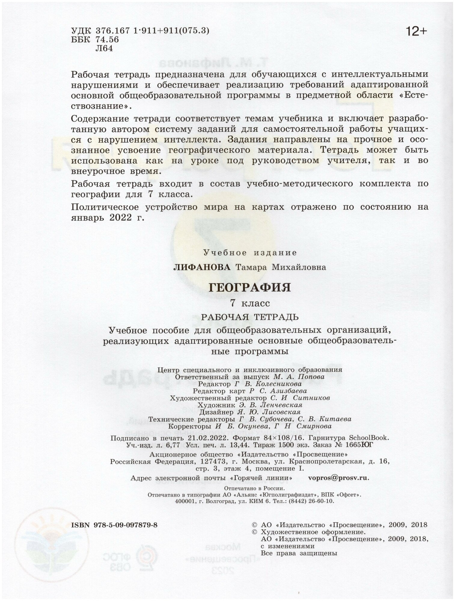 География. 7 класс. Рабочая тетрадь для учащихся специальных образовательных учреждений VIII вида (Лифанова Тамара Михайловна); Просвещение, 2023