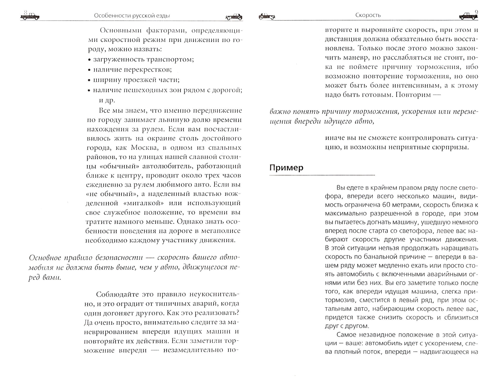Давно известно, что люди зачастую сами создают себе трудности, а затем их героически преодолевают. Книга написана для тех, кто не хочет попадать в сложные ситуации на дороге, а затем демонстрировать чудеса техники экстремального вождения. Навыки этой техники со временем утрачиваются, а вот манера в меру осторожного и быстрого передвижения становится год от года только устойчивей и совершенней. Она постепенно занимает место в сознании водителя и ежесекундно помогает вам в процессе вождения, даже если вы этого не замечаете.