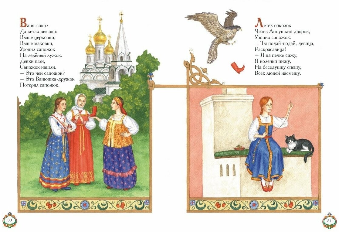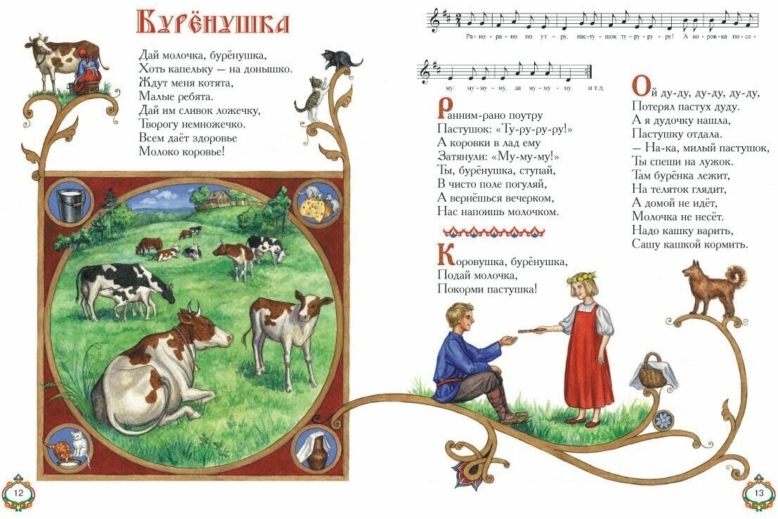 Ко многим песенкам даны нотные партитуры, каждая страница украшена оригинальными иллюстрациями с витиеватым орнаментом, а некоторые страницы оформлены русской колоритной рамочкой. Книга знакомит детей с русским фольклором. Симпатичные иллюстрации очень нравится разглядывать ребенку и изучать названия животных и птиц. Несложные и недлинные стихотворения и песенки без труда разучит любой малыш. И здание можно рекомендовать и для чтения в детском саду.