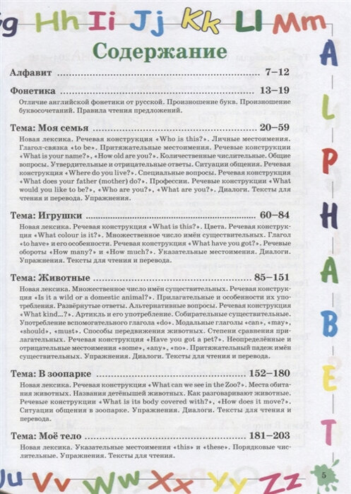 В издании очень доступно излагается материал по 14 темам. В самом начале книги есть английский алфавит и фонетика, с помощью которой ребенок правильно научится произносить поначалу сами буквы английского языка, а потом ознакомится с тем, как некоторые буквы могут видоизменяться по звучанию в разных словах, так же получит знания, как правильно читать транскрипцию новых слов. Проиллюстрированы все темы занимательными картинками и поддерживают заинтересованность детей на протяжении всего обучения. Совершенно ненавязчивый игровой процесс пособия вызывает интерес и побуждает ребенка учиться.