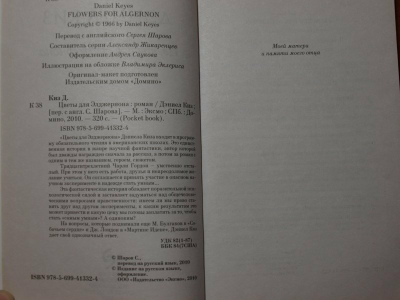 "Цветы для Элджернона" Дэниела Киза входят в программу обязательного чтения в американских школах. Это единственная история в жанре научной фантастики, автор которой был дважды награжден сначала за рассказ, а потом за роман с одним и тем же названием, героем, сюжетом.