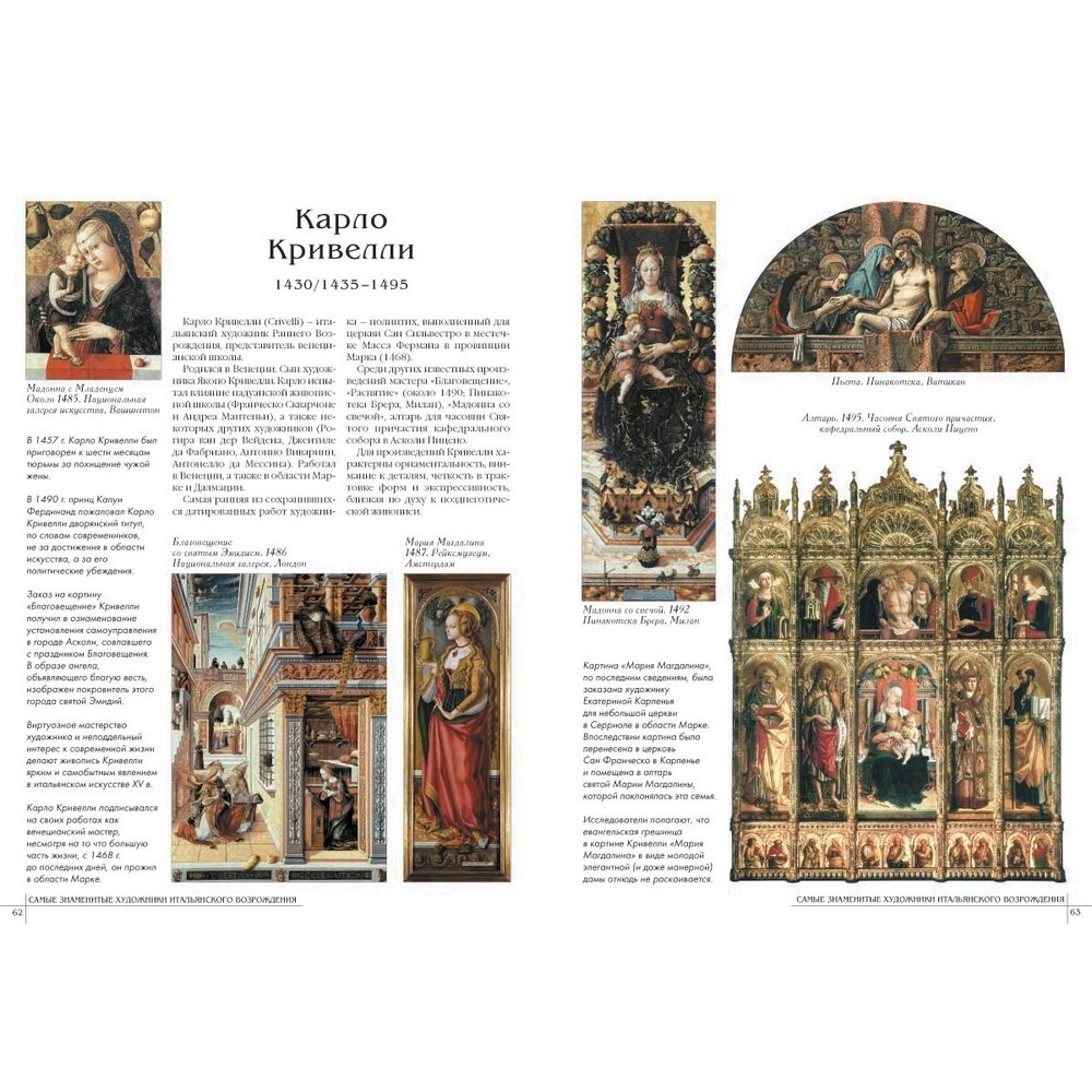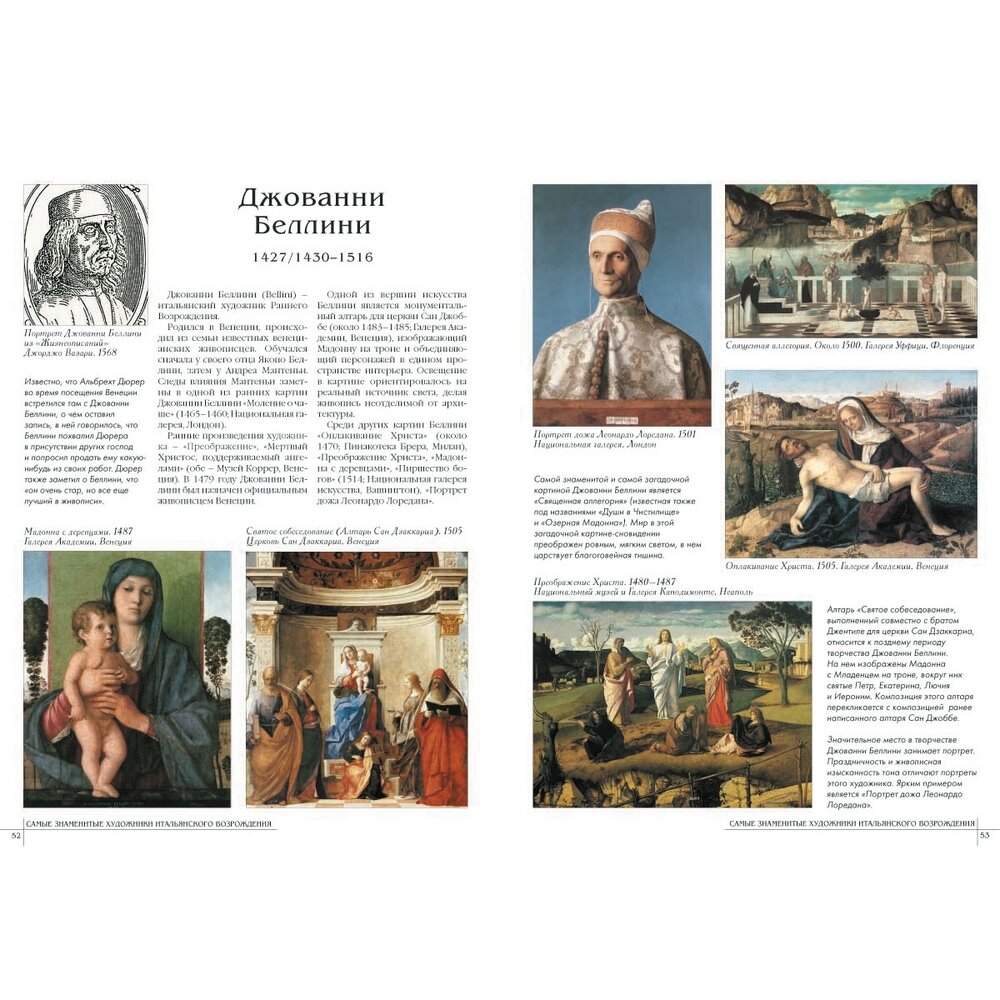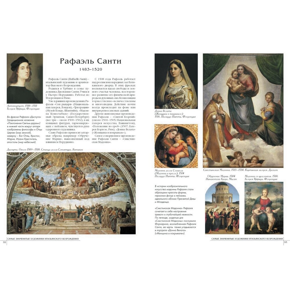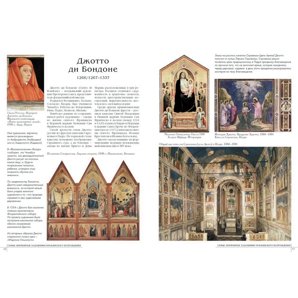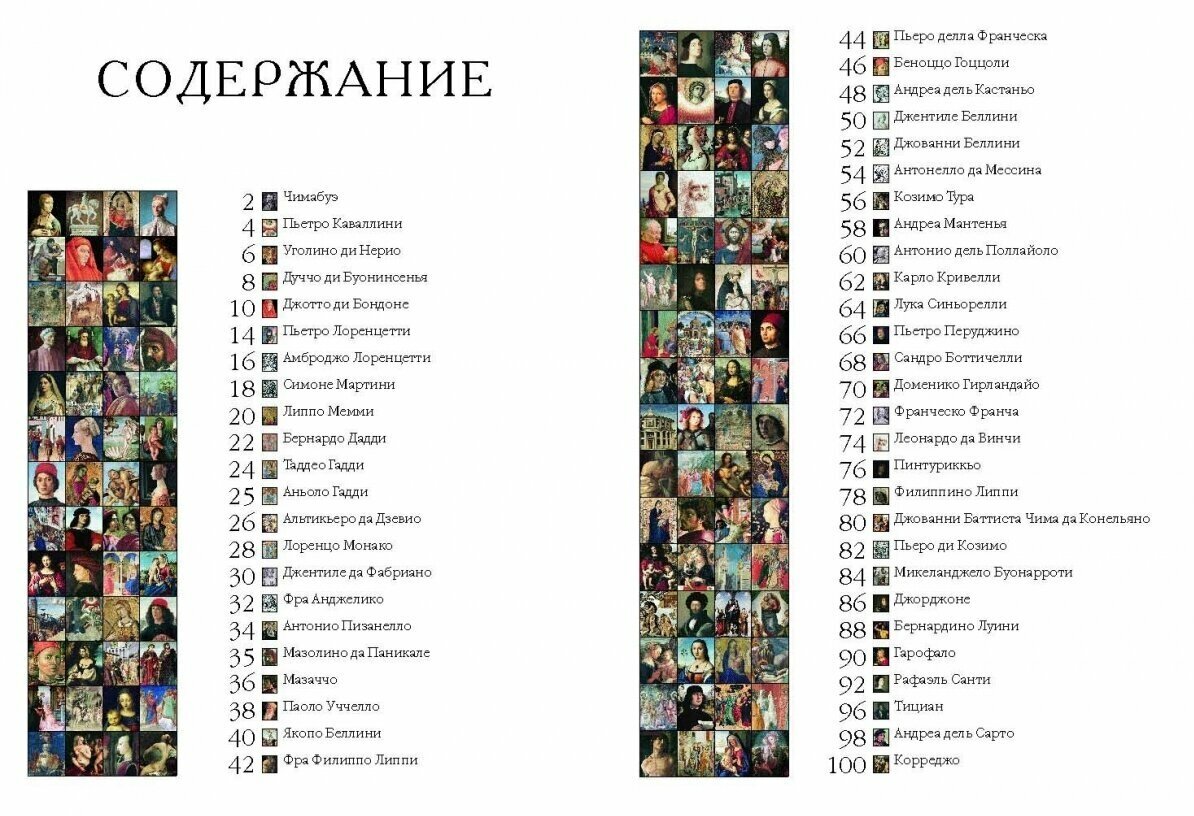 Каждому из 50 художников выделен разворот (больше - Джотто и Рафаэль), очень и очень кратко биография художника, характеристика творчества, основные произведения +5,6 репродукций.Главный минус книги - очевидно не стоило представлять многофигурные произведения в полном объеме, полный вид росписи свода Сикстинской капеллы размером 17 см х 6 см смотрится не очень хорошо. В целом поставить четверку заставляет цена книги. -