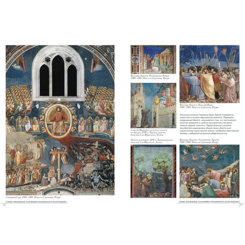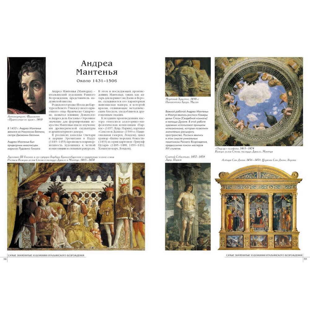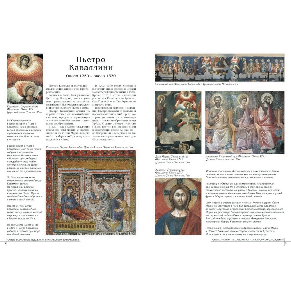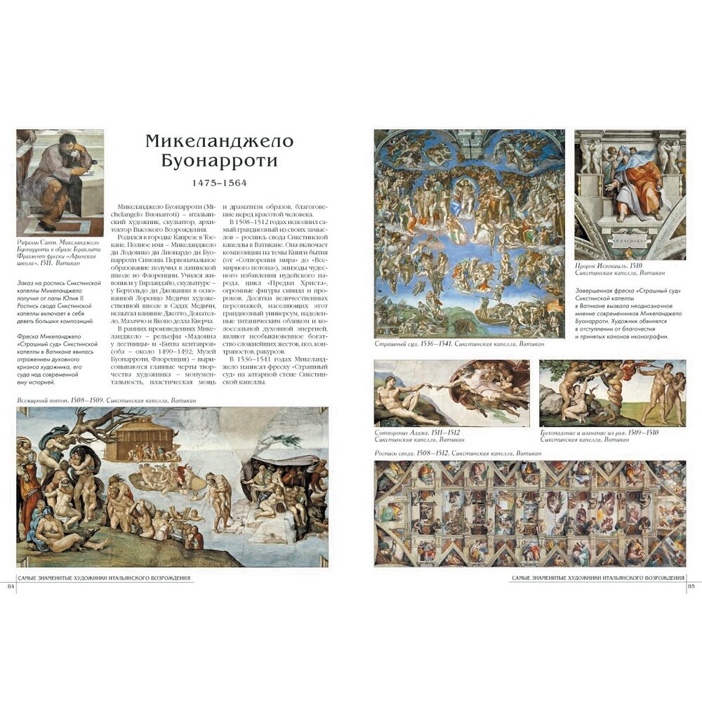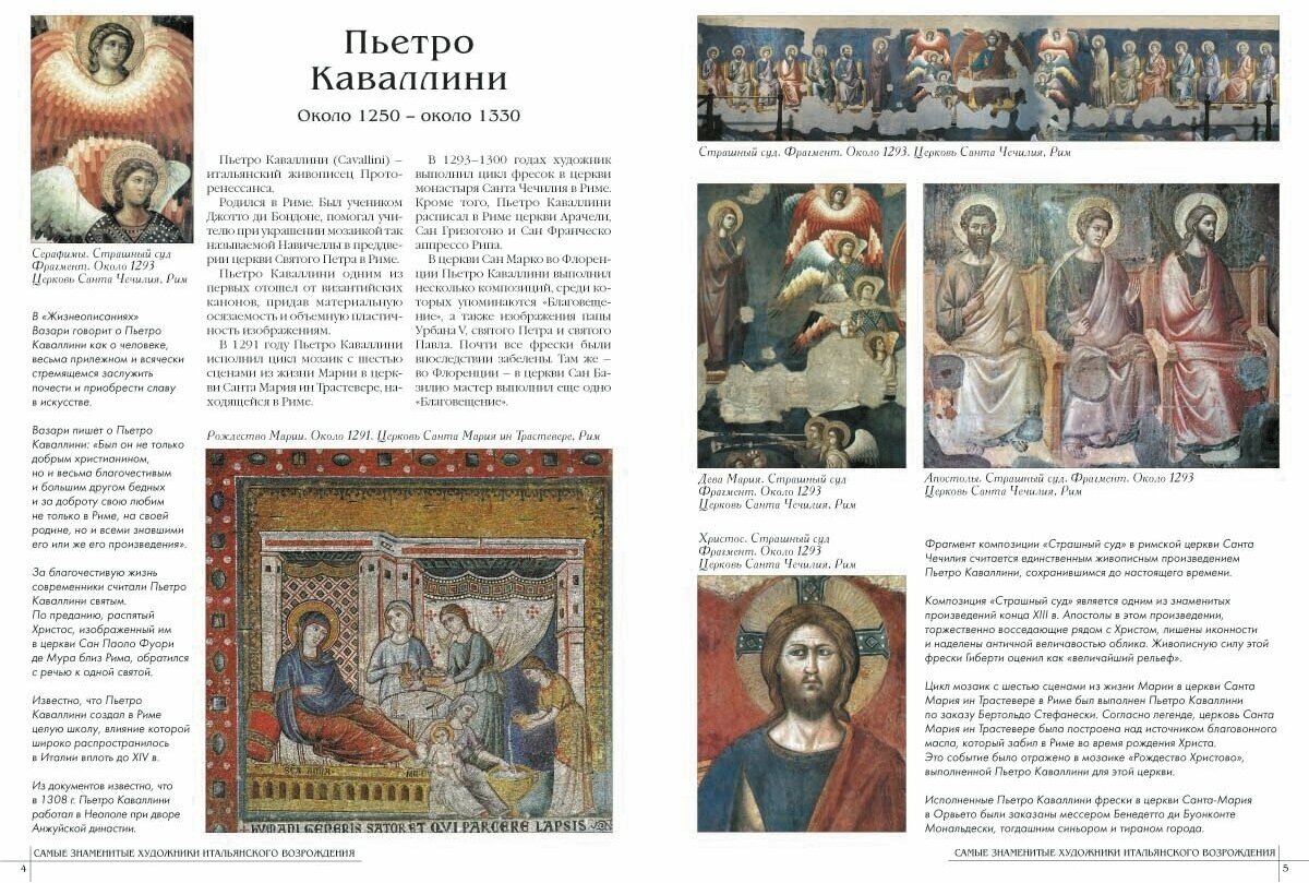Каждому из 50 художников выделен разворот (больше - Джотто и Рафаэль), очень и очень кратко биография художника, характеристика творчества, основные произведения +5,6 репродукций.Главный минус книги - очевидно не стоило представлять многофигурные произведения в полном объеме, полный вид росписи свода Сикстинской капеллы размером 17 см х 6 см смотрится не очень хорошо. В целом поставить четверку заставляет цена книги. -