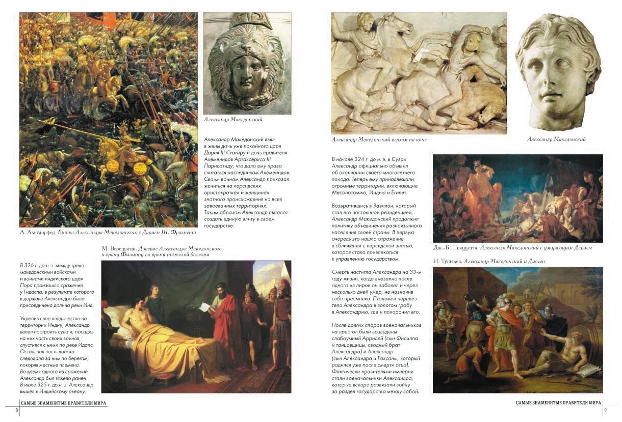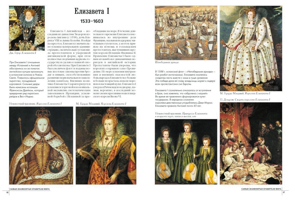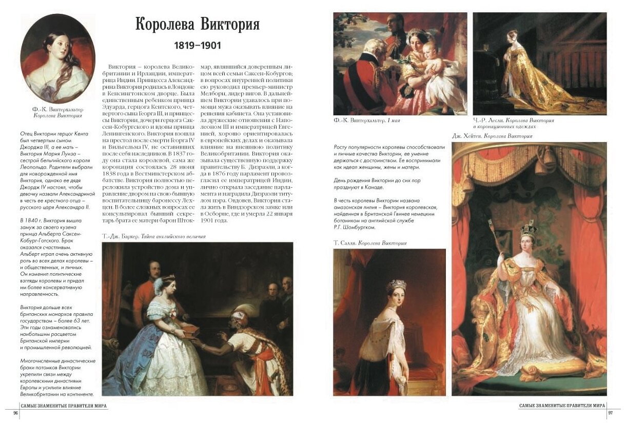 Много качественных, красивых иллюстраций: репродукции парадных портретов самих правителей, портретов их супруг или любовниц (всё правильно: как, например, королева Виктория без принца Альберта? А Генрих VIII без своих жён? А Людовик XV без мадам де Помпадур? Или Наполеон без Жозефины? Хотя вот Екатерина Великая тут обошлась и без портретов Петра III или Потёмкина, несмотря на два отведённых ей разворота - может, особая щепетильность издателей?:)), а также репродукции изображений знаменитых битв, охоты, бытовых сцен и т.п.
