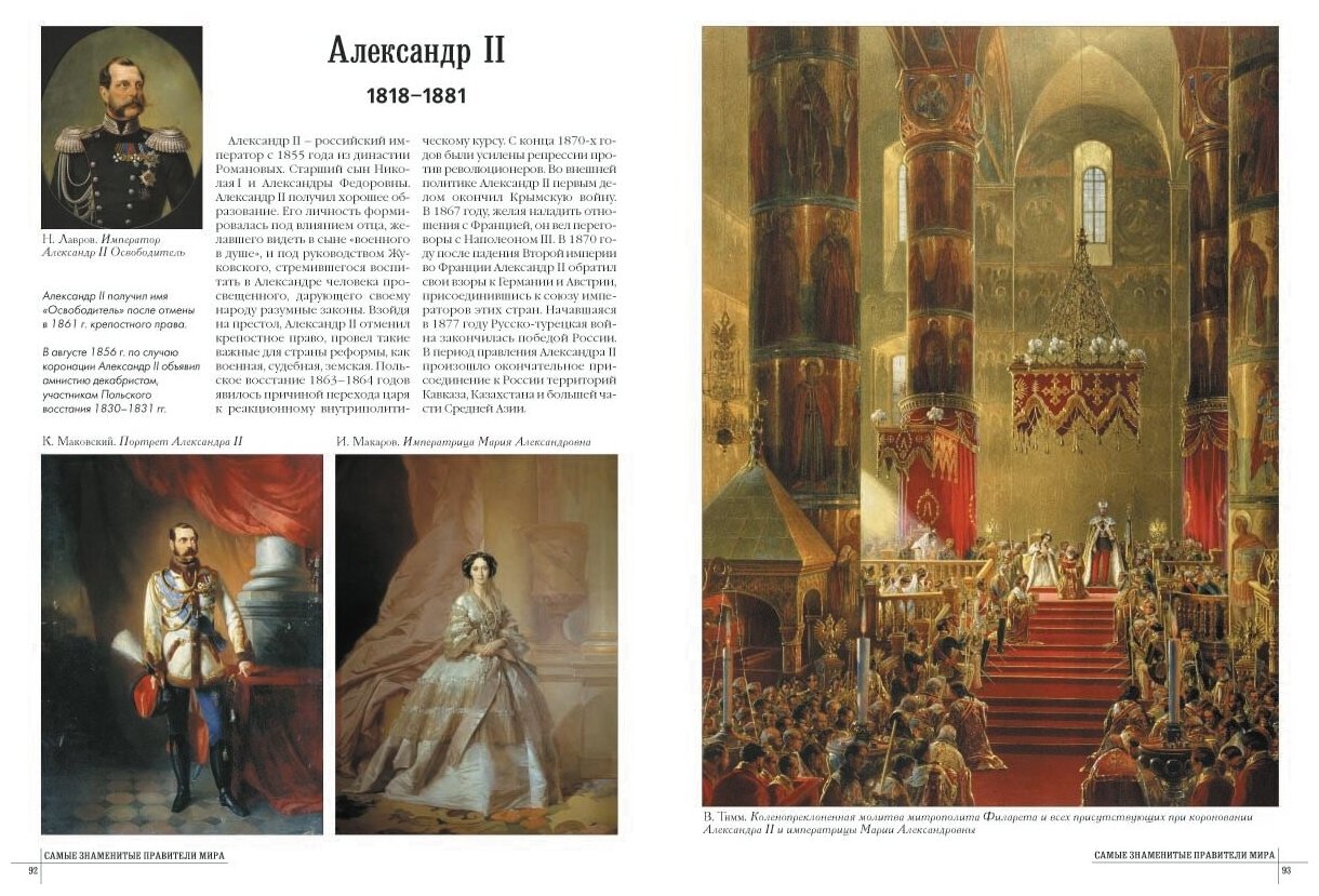Итак, в книге даны краткие жизнеописания пятидесяти правителей, начиная с древнеегипетского фараона Аменхотепа IV, правившего в 14 в. до н.э., и заканчивая нашим Александром III, почившим в 1894 году "в Крыму в окружении своей семьи от нефрита" (с), (пунктуация оригинала сохранена).