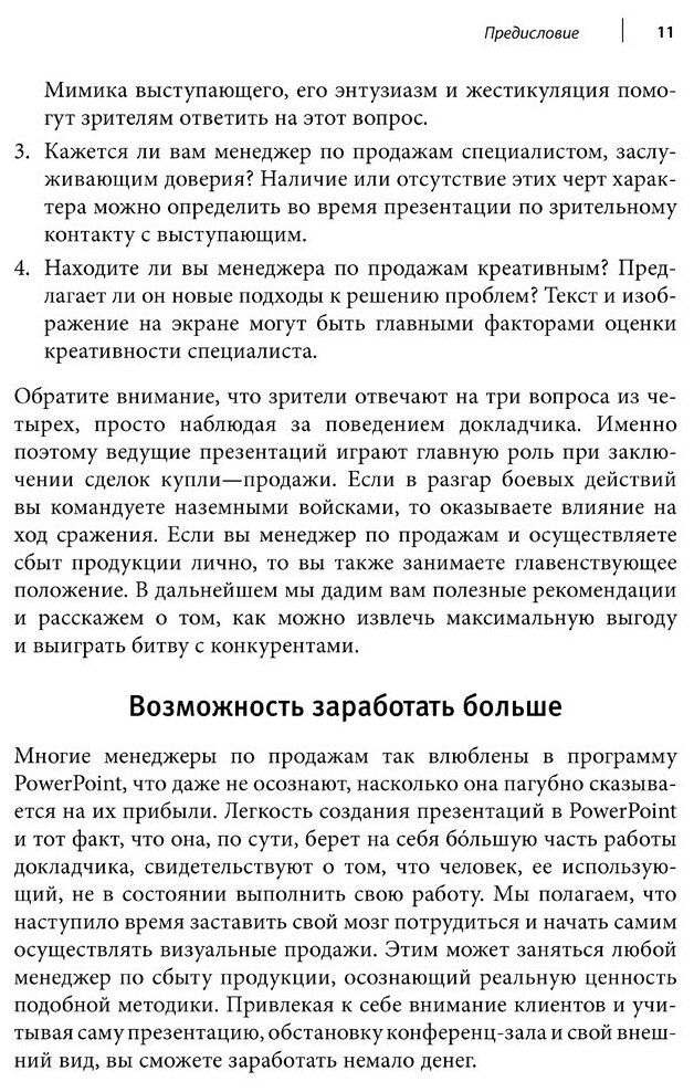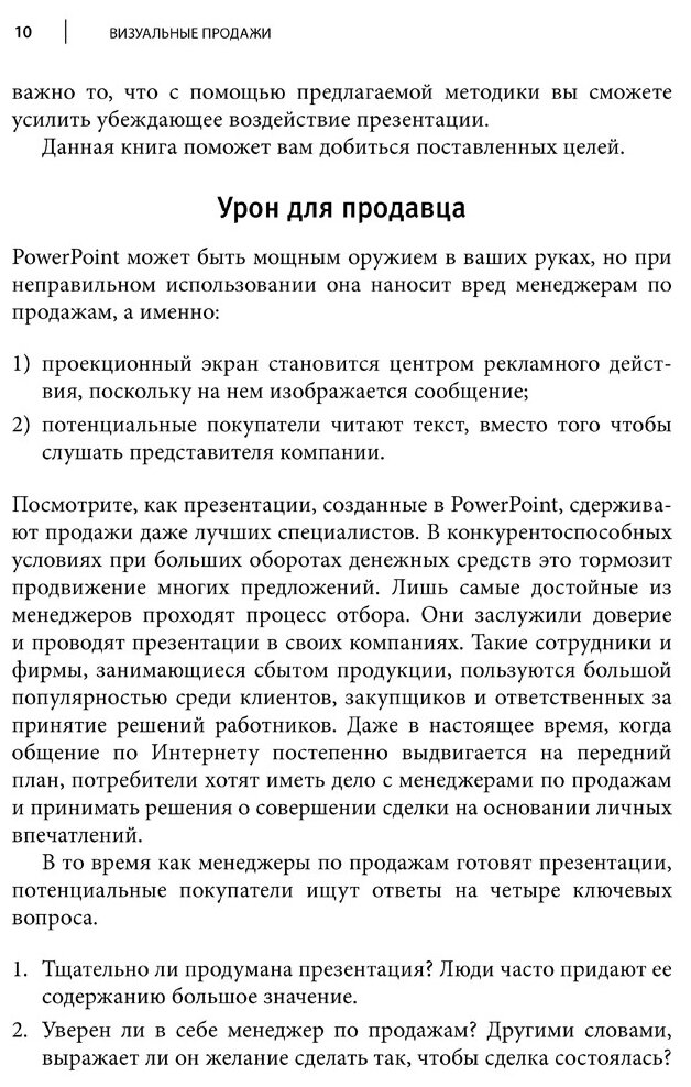 Я много читал по данной тематике, но до того, как мне попалась в руки эта книга, я не придавал особого значения визуализации. Но, еще не дочитав книгу до конца, я осознал, что многое упустил! Ведь, как оказалось, на клиентов огромное влияние оказывают как элементы окружающей обстановки, так и внешний вид и жестикуляция продавца.