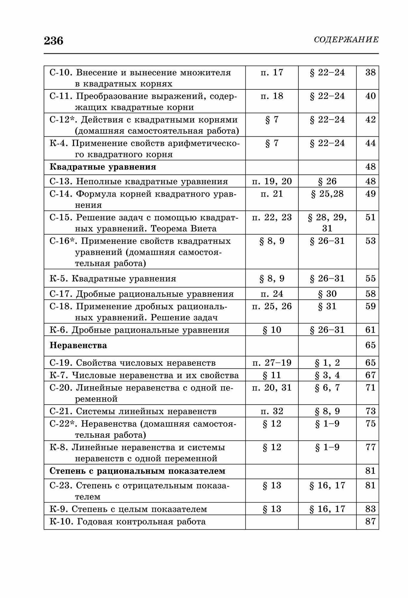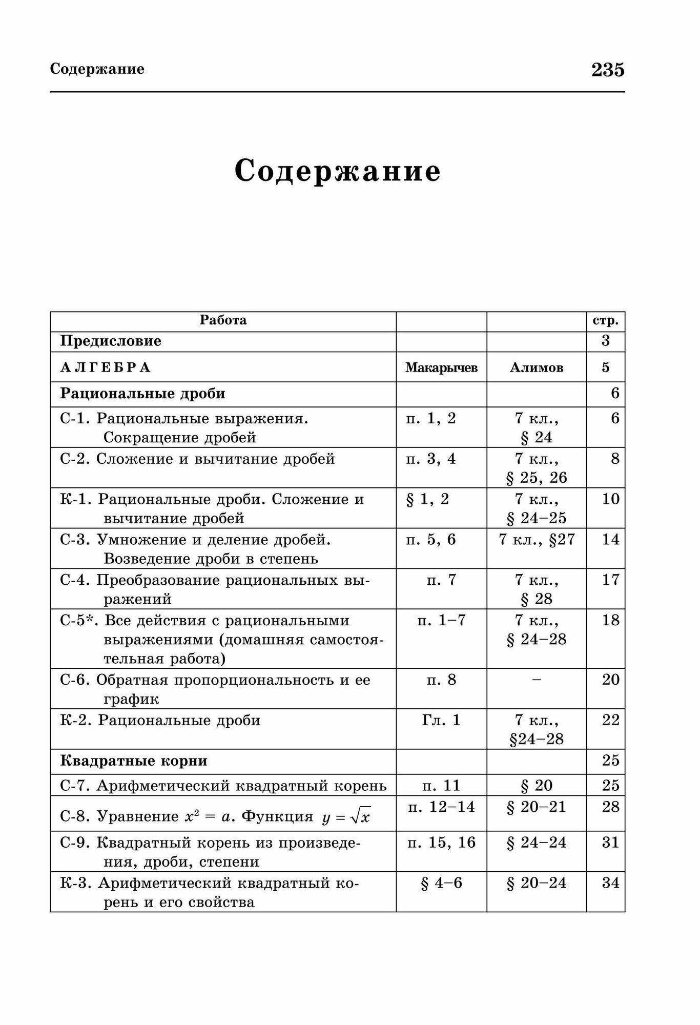 4. Тематика и содержание работ охватывают требования действующей программы по математике для 8 класса. Для удобства пользования книгой приводится таблица тематического распределения работ по учебникам Ю.Н.Макарычева и др., Ш.А.Алимова и др., А.В. Погорелова и Л.С. Атанесяна. -