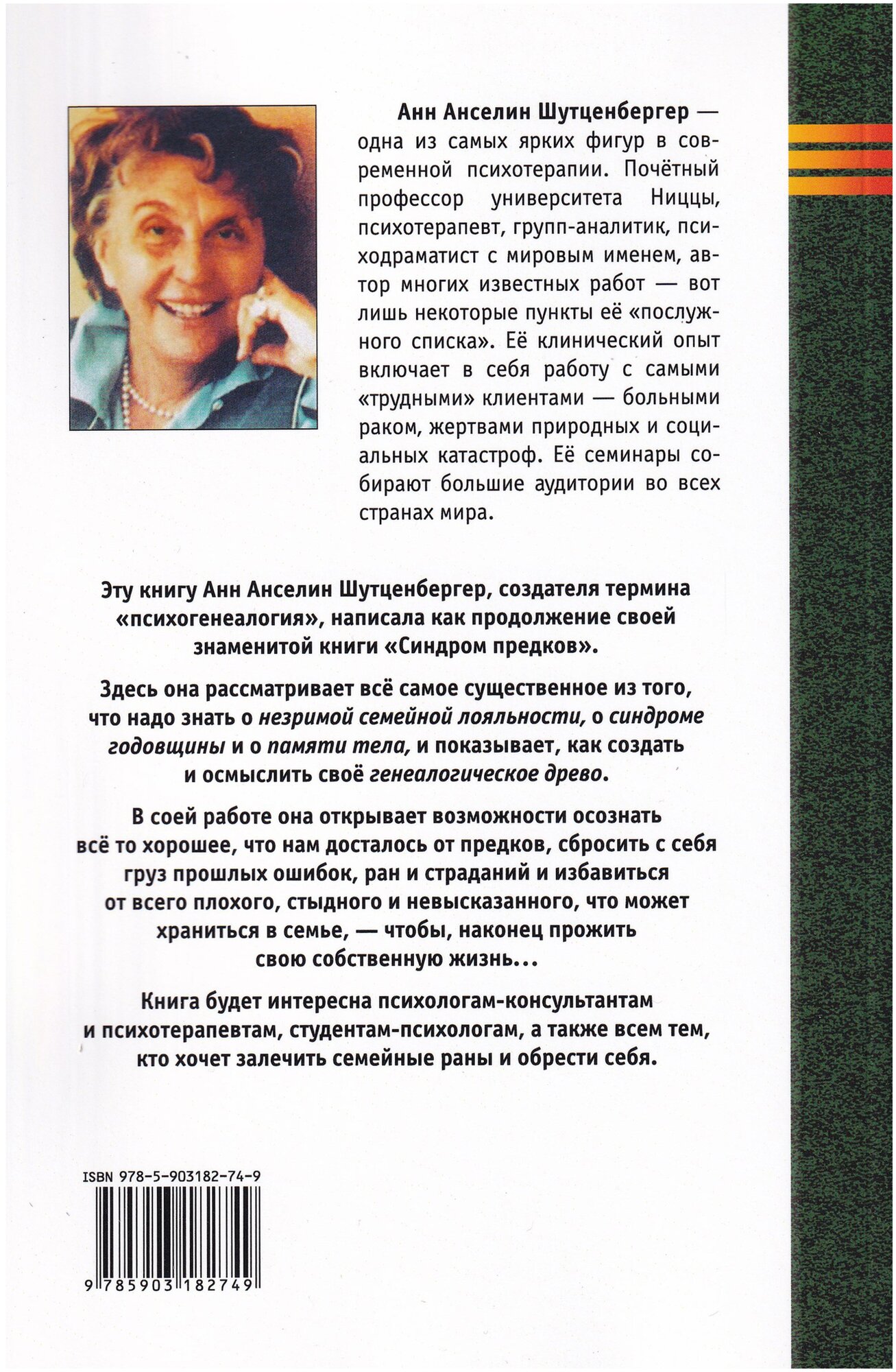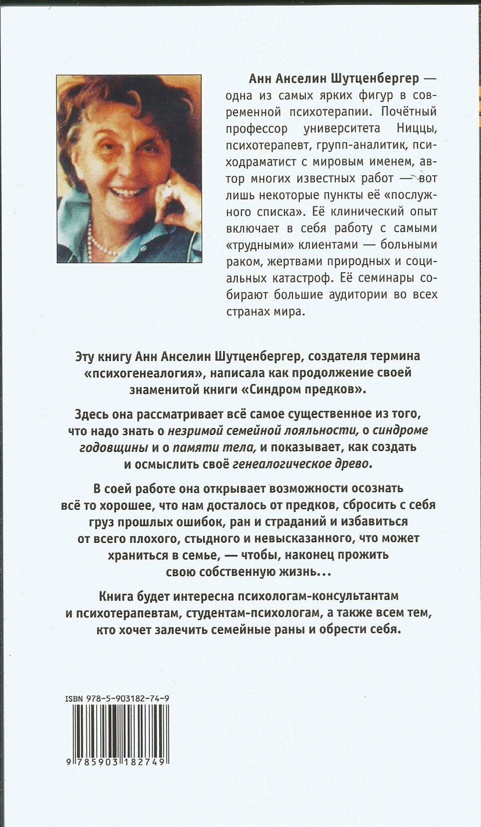 Анн Анселин Шутценбергер - почетный профессор университета Ниццы, психотерапевт, психодраматист с мировым именем, одна из самых ярких фигур в современной психотерапии. Ее клинический опыт включает в себя работу с самыми тяжелыми клиентами.