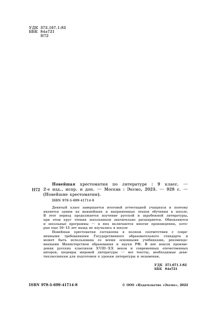 Новейшая хрестоматия составлена в полном соответствии с современными требованиями Государственного образовательного стандарта и может быть использована со всеми основными учебниками, рекомендованными Министерством образования и науки РФ. В нее вошли памятники древнерусской литературы, произведения русских классиков XVIII-XX веков и современных отечественных авторов, шедевры мировой литературы - все тексты, необходимые девятиклассникам для занятий в классе, при подготовке к урокам литературы и экзаменам.