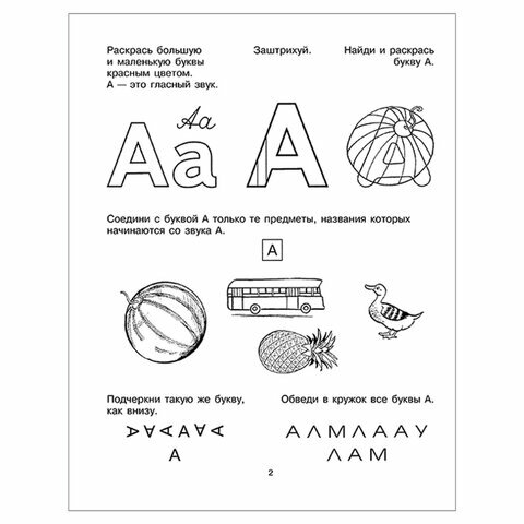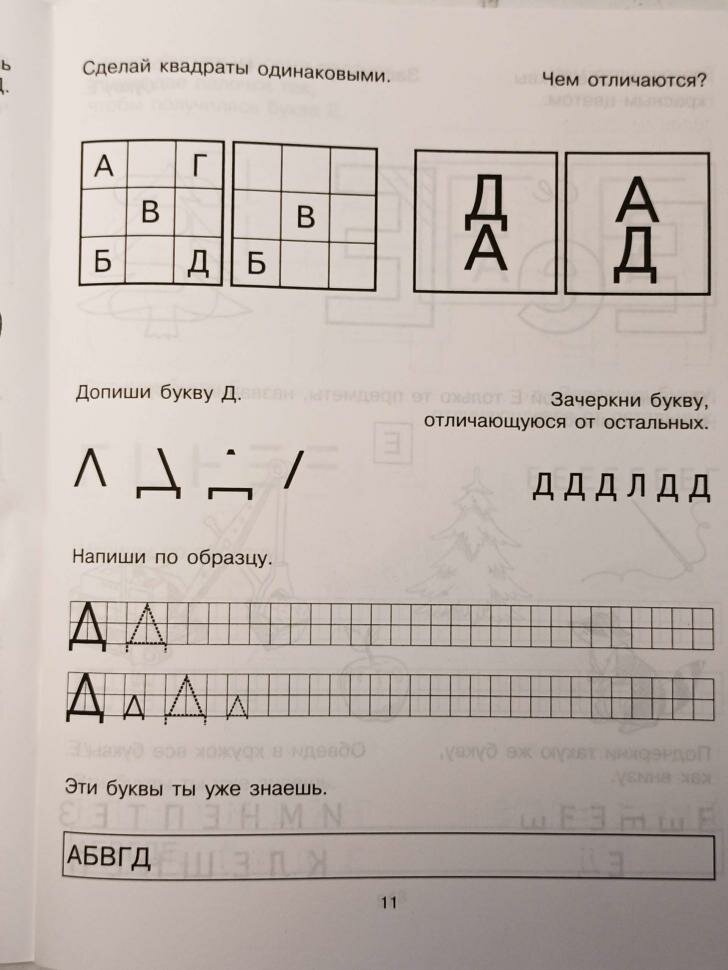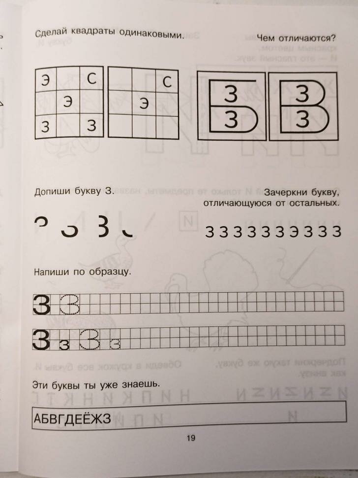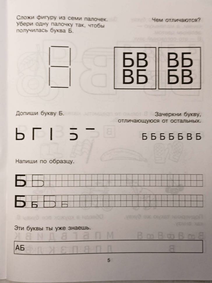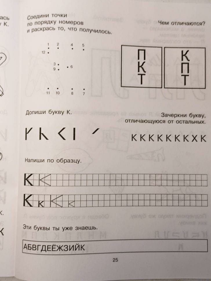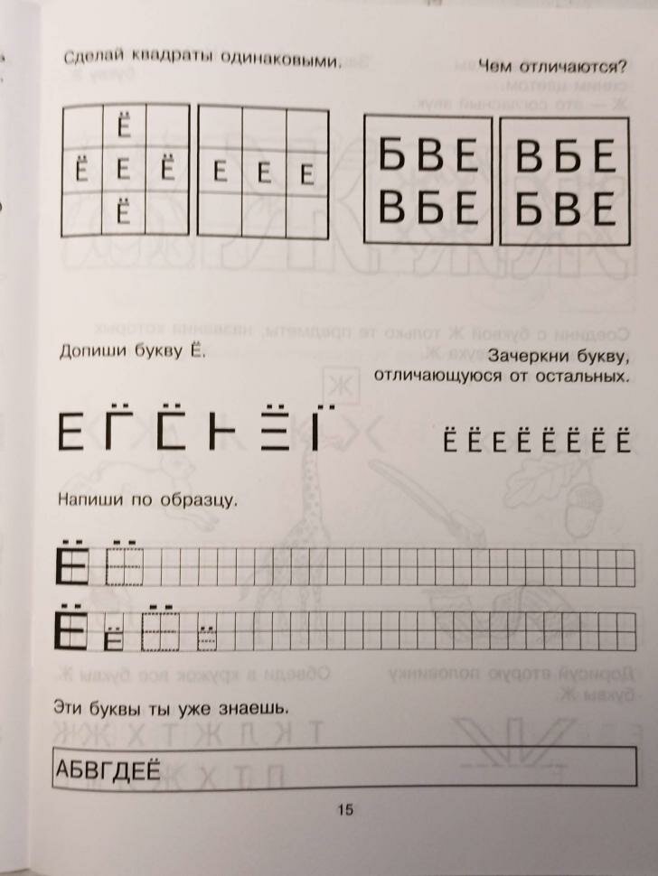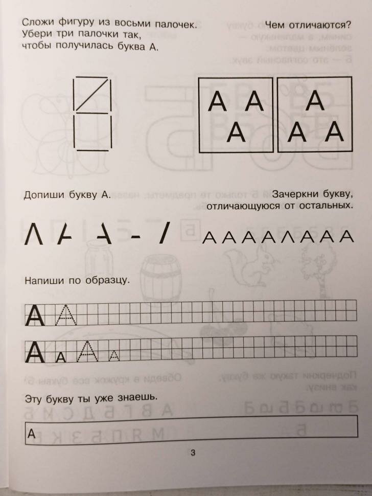 Задания расположены очень удобно - на каждый разворот - одна буква. Выполняются ребёнком за 10 минут, но задания настолько разнообразны, что ребёнок легко запоминает каждую букву и даже вверх ногами её узнаёт :)