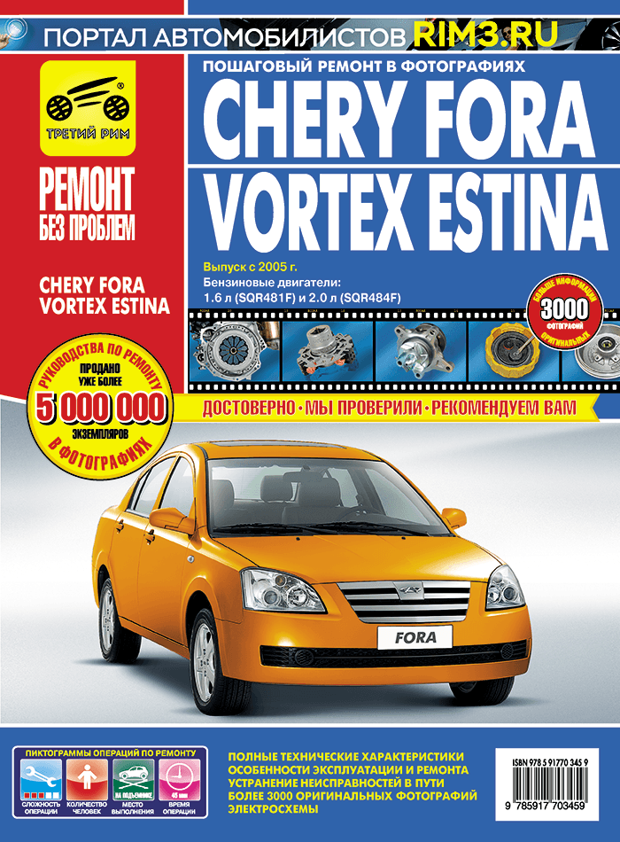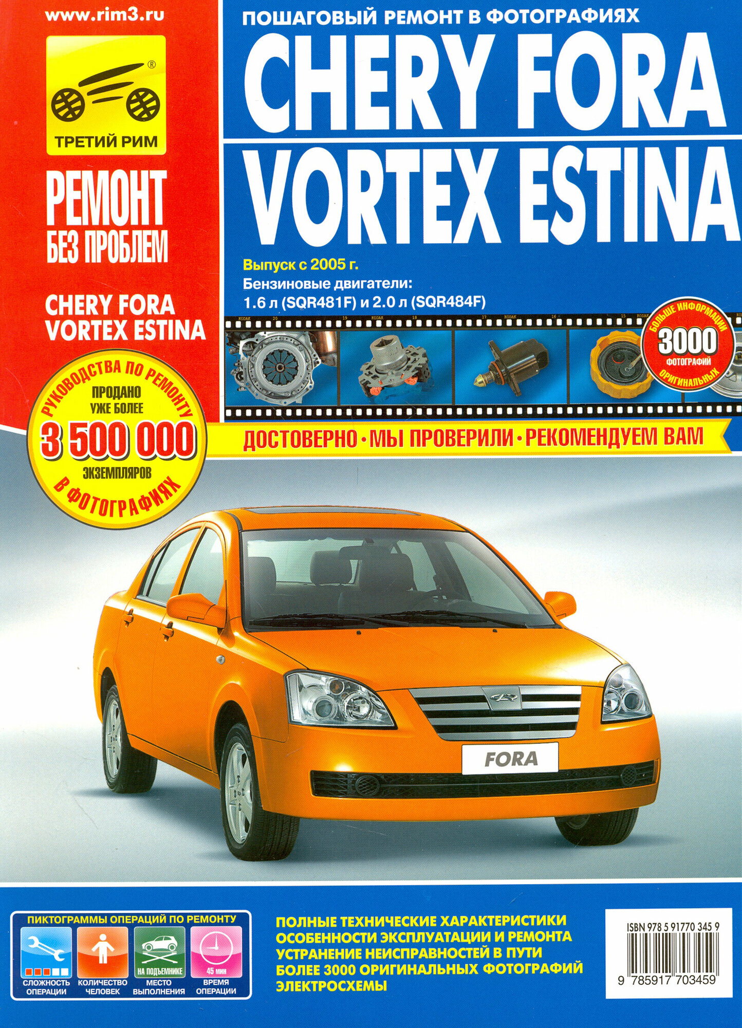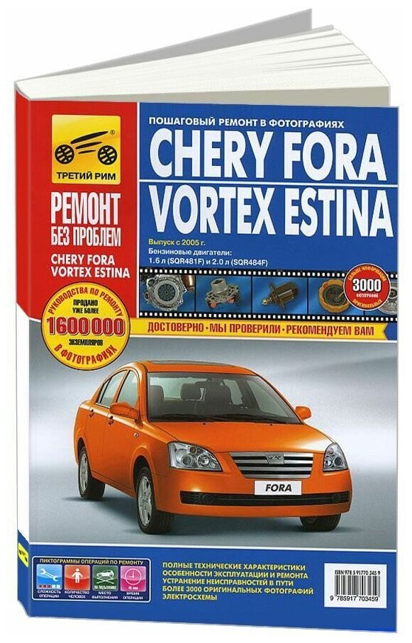 Книга полезная для владельцев Чери Фора и ее аналога Вортекс Эстина. Сам езжу на Чери Фора два литра двигатель. Долго думал брать-не брать. Дорогая. Заказал давненько уже. Пришла в хорошем состоянии несмотря на год издания. Скоро эту книгу вообще не найдешь нигде. А машины еще будут бегать. Оказались довольно крепкими моделями они. Владельцу конечно нужно такую книгу иметь.