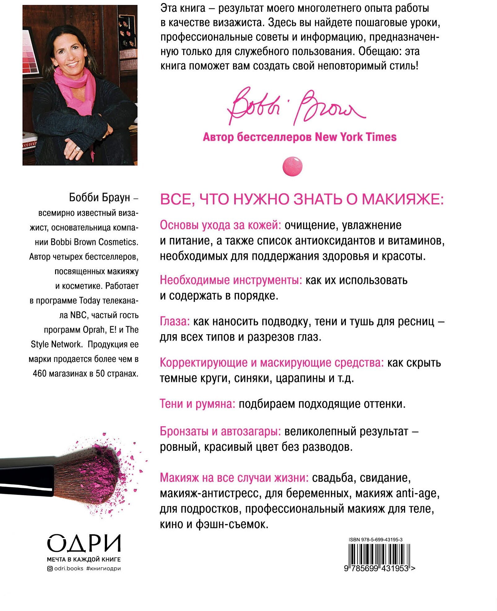 Имя автора книги говорит само за себя, а кто не знает Бобби Браун, то поясню. Бобби Браун по профессии театральный гример. Известна она, как профессиональный визажист, работающая на подиумах с моделями и со знаменитостями. Кроме того, Бобби Браун основательница одноименной косметической линии. Вообщем человек профессионал,книги которой ценятся в кругу визажистов и просто людей, которые интересуются косметикой. Книга - не разочаровала, она прекрасно подходит для новичков, которые только постигают азы визажа, так будут интересны и начинающим специалистам. От радости, что книга Бобби Браун вышла на русском языке, я купила две - одну в подарок. Страницы глянцевые, с качественной печатью, красивыми иллюстрациями и подробными советами автора.