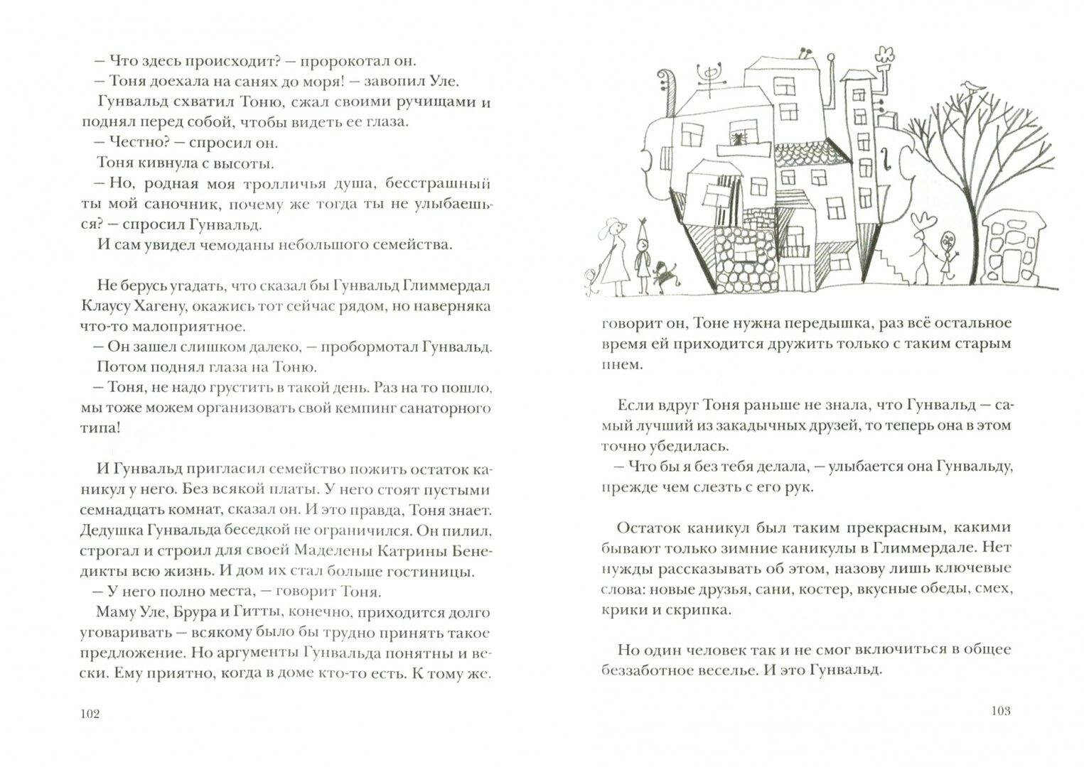 Девочка Тоня по прозвищу "гроза Глиммердала" - единственный ребенок в норвежской глухой деревушке. Тоне десять лет, у нее есть снегокат и твердая уверенность в том, что главное в жизни - "скорость и самоуважение". Когда она мчится с гор, распевая во весь голос и сверкая рыжей копной волос, вся деревня знает, что едет самый главный человек в долине. А еще у Тони есть лучший друг - старик Гунвальд, который печет для нее кексы и играет ей на скрипке. ""Гунвальд, что бы ты делал без меня?" - часто спрашивает Тоня. "Я бы сам закопал себя в землю и сдох", - отвечает Гунвальд".