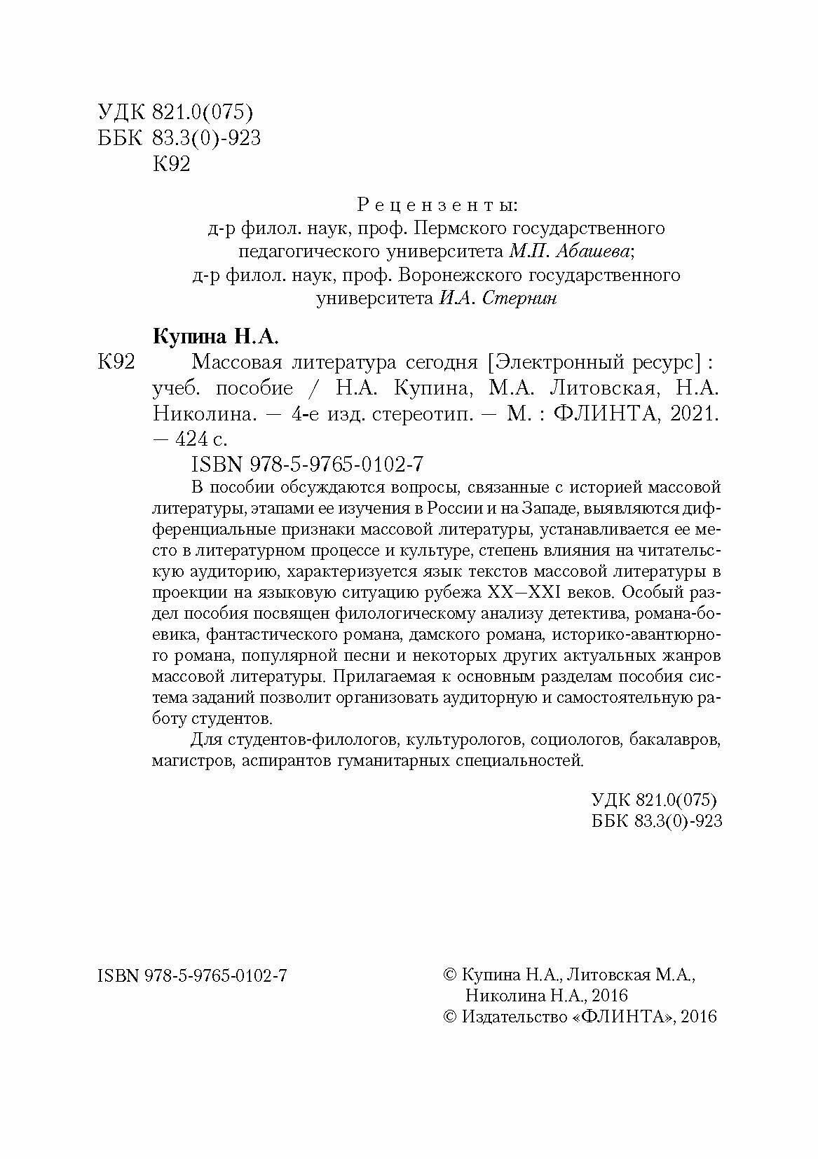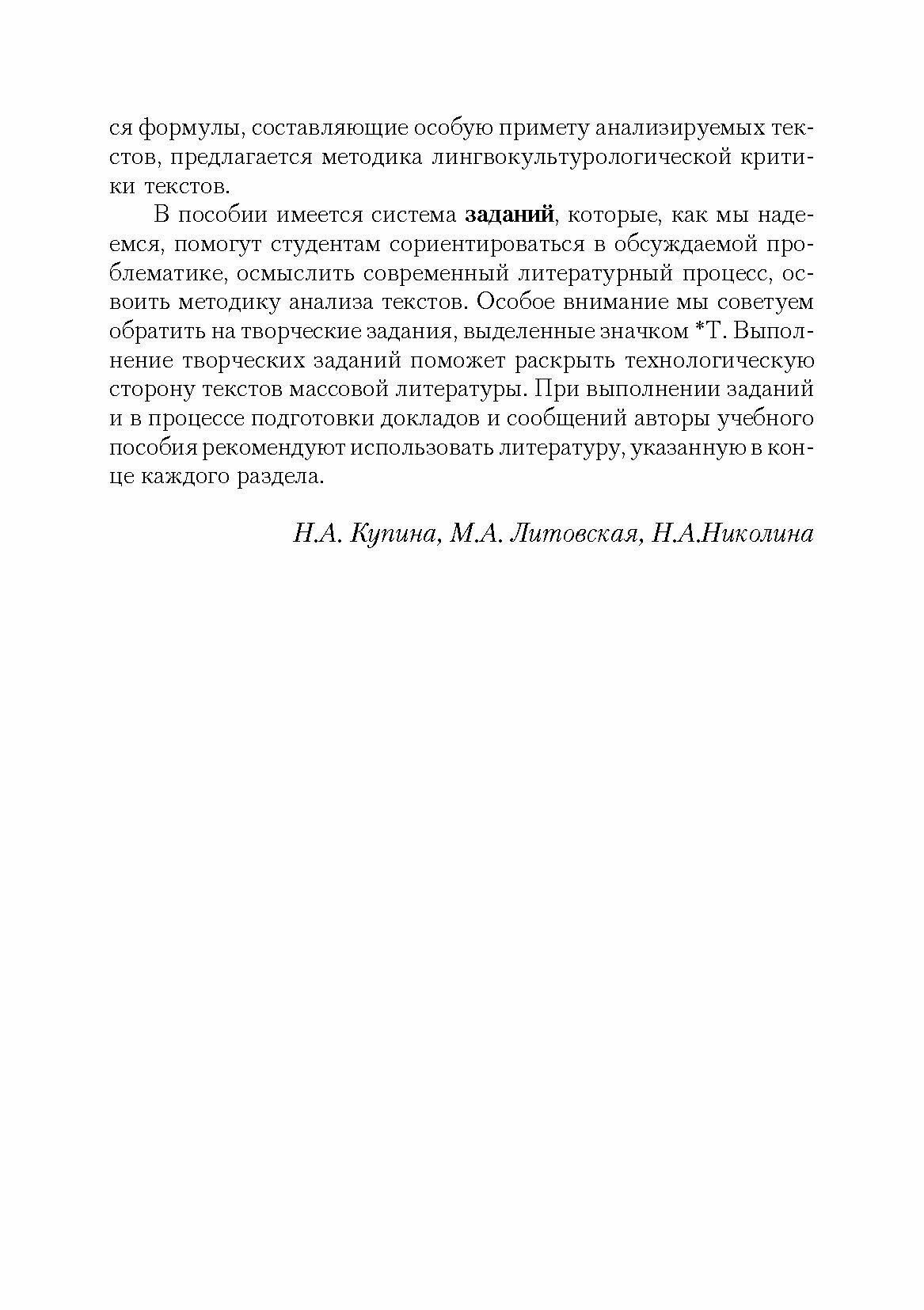 Массовая литература сегодня. Учебное пособие (Купина Наталия Александровна, Николина Наталия Анатольевна, Литовская Мария Аркадьевна); Флинта, 2010