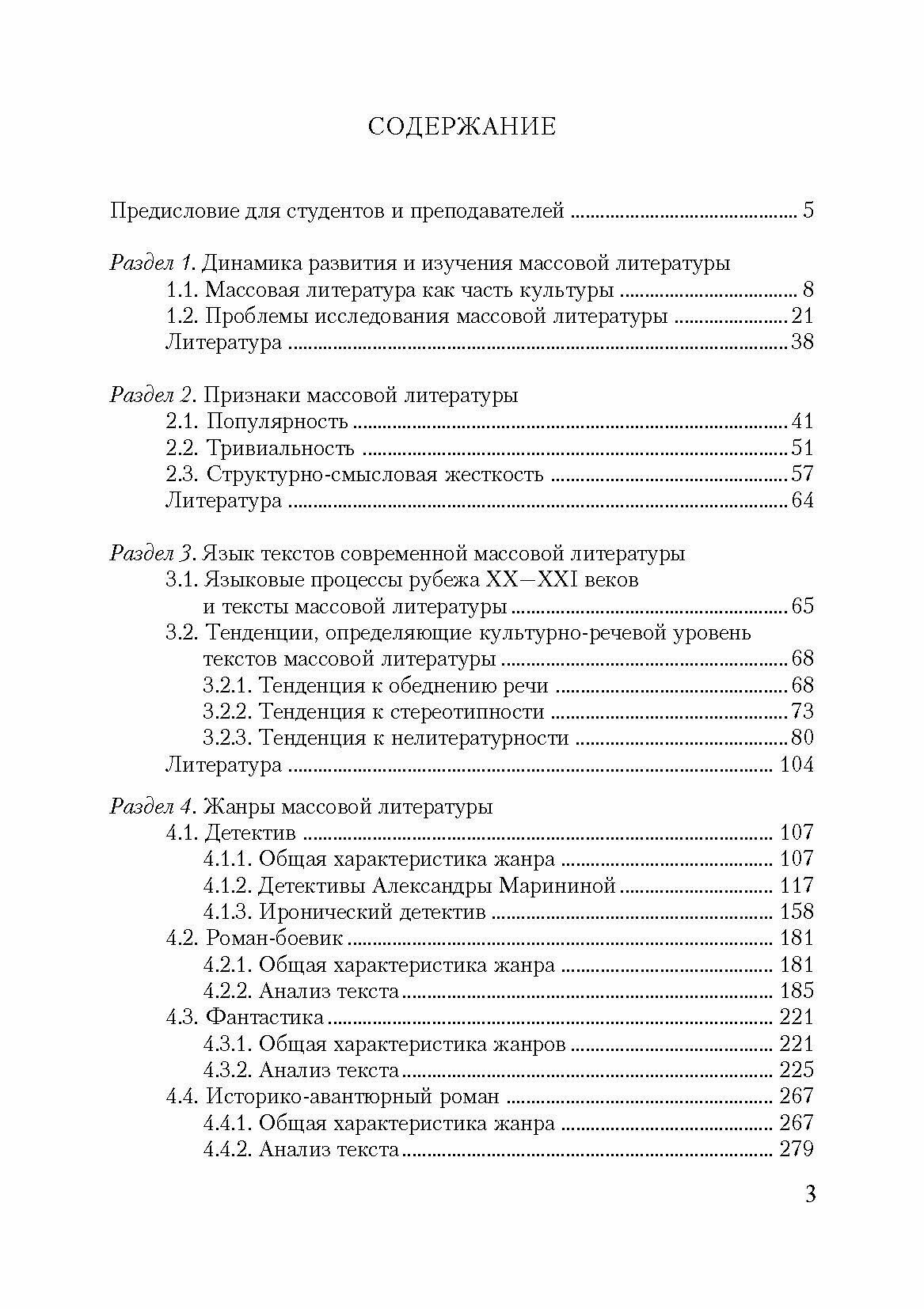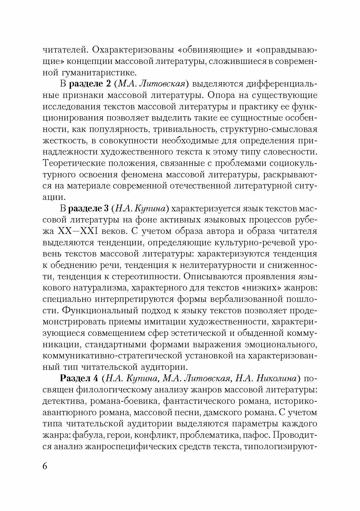 Пособие посвящено современной массовой литературе. Обсуждены вопросы, связанные с историей массовой литературы, этапами ее изучения в России и на Западе, выявлены дифференциальные признаки массовой литературы, установлено ее место в литературном процессе и культуре, степень влияния на читательскую аудиторию, охарактеризован язык текстов массовой литературы в проекции на языковую ситуацию рубежа ХХХХI вв. Особый раздел пособия посвящен филологическому анализу детектива, романа-боевика, фантастического романа, дамского романа, исторического (костюмного) романа, массовой песни и некоторых других актуальных жанров массовой литературы. Прилагаемая к основным разделам система заданий позволит организовать аудиторную и самостоятельную работу студентов.