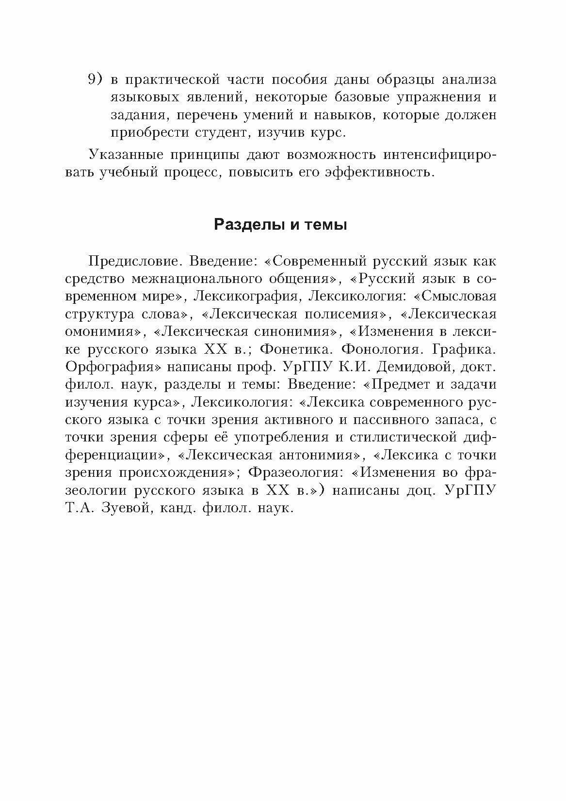 Учебное пособие по СРЛЯ написано известными лингвистами, преподавателями УрГПУ К.И. Демидовой и Т.А. Зуевой. Рекомендуется студентам, изучающим курс СРЯ «Лексика/фонетика». Книга состоит из тем, после которых идёт терминологический минимум, задания, а также образцы анализа, если он присутствует в теме. Такое построение книги повторяет за собой структуру вузовского обучения, и поэтому пособие будет эффективно в самостоятельной работе студента, особенно студента-заочника. Сам материал пособия включает в себя главные положения, касаемые лексикологии, фонетики, плюс информация о современных тенденциях в данных науках. Рекомендую всем филологам.