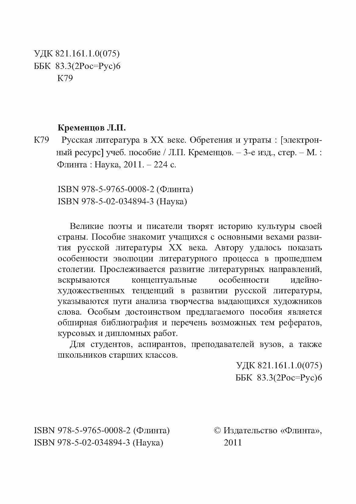 Русская литература в XX в. Обретения и утраты (Кременцов Леонид Павлович); Флинта, 2008