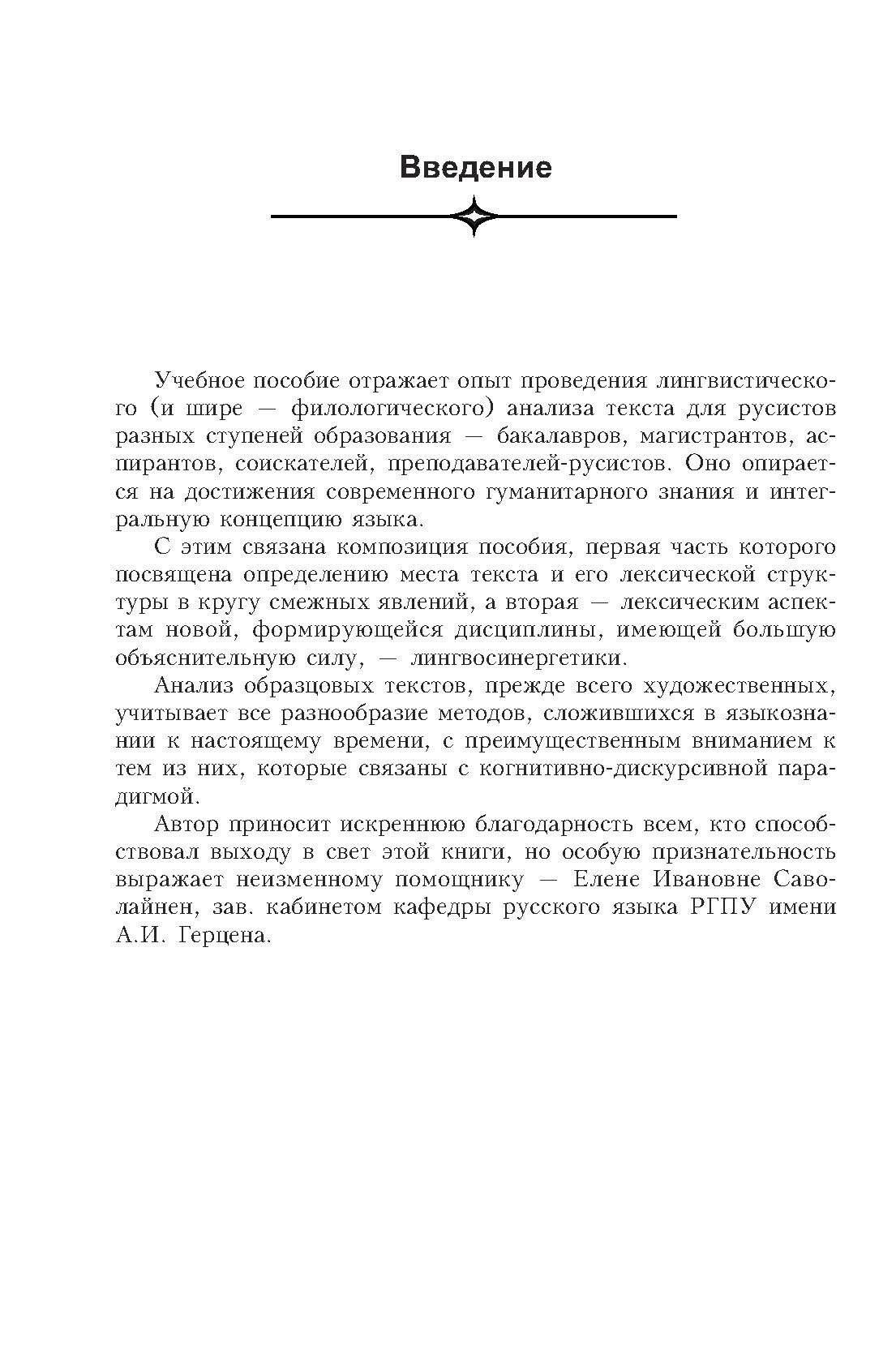 Пособие отражает опыт проведения лингвистического (и шире - филологического) анализа текста и опирается на достижения современного гуманитарного знания и интегральную концепцию языка. Первая часть посвящена определению места текста и его лексической структуры в кругу смежных явлений, а вторая - лексическим аспектам новой, формирующейся дисциплины - лингвосинергетики, имеющей большую объяснительную силу. Анализ текстов в пособии учитывает все разнообразие методов современного языкознания.