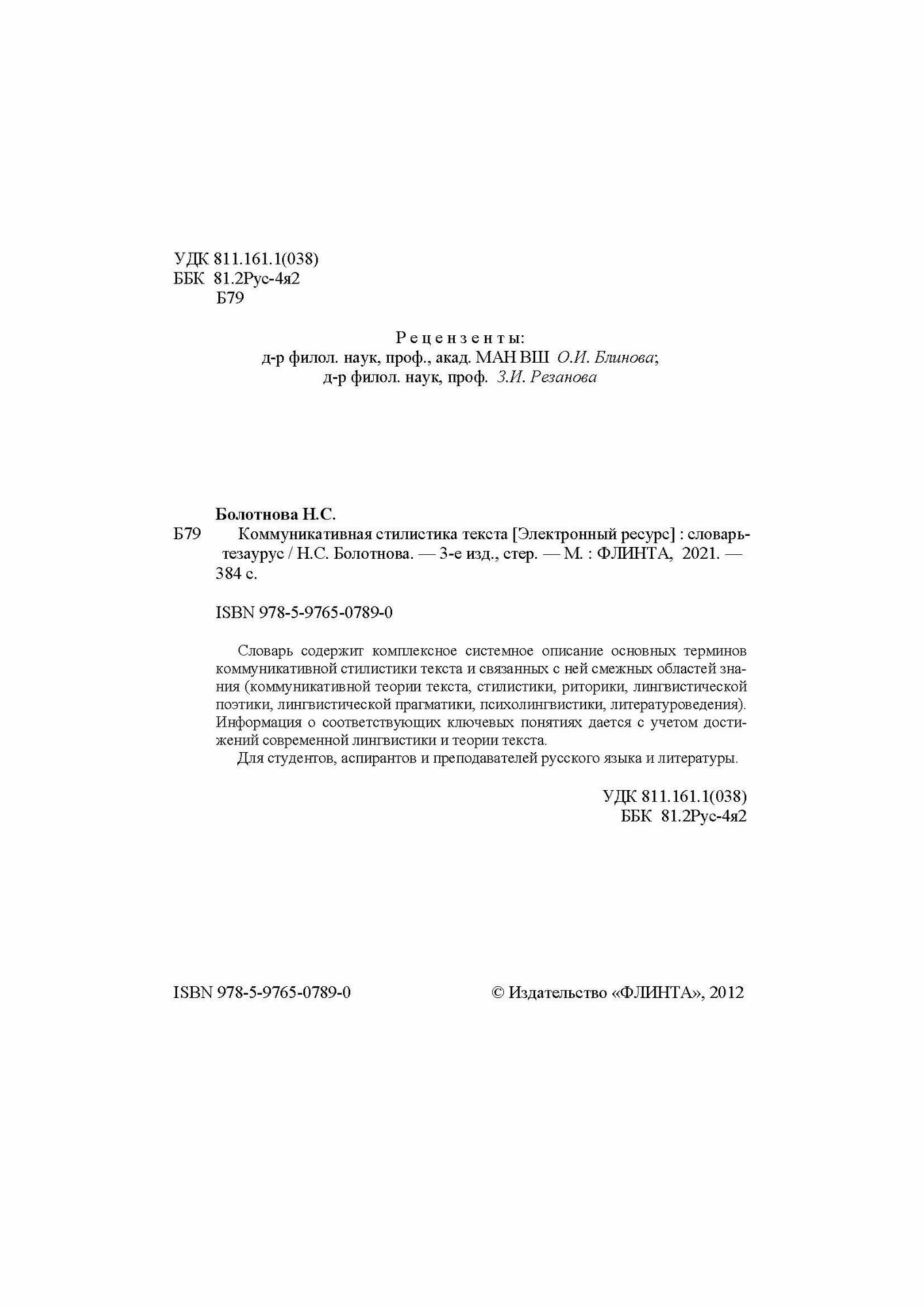 Словарь содержит комплексное системное описание основных терминов коммуникативной стилистики текста и связанных с ней смежных областей знания (коммуникативной теории текста, стилистики, риторики, лингвистической поэтики, лингвистической прагматики, психолингвистики, литературоведения). Информация о соответствующих ключевых понятиях дается с учетом достижений современной лингвистики и теории текста.