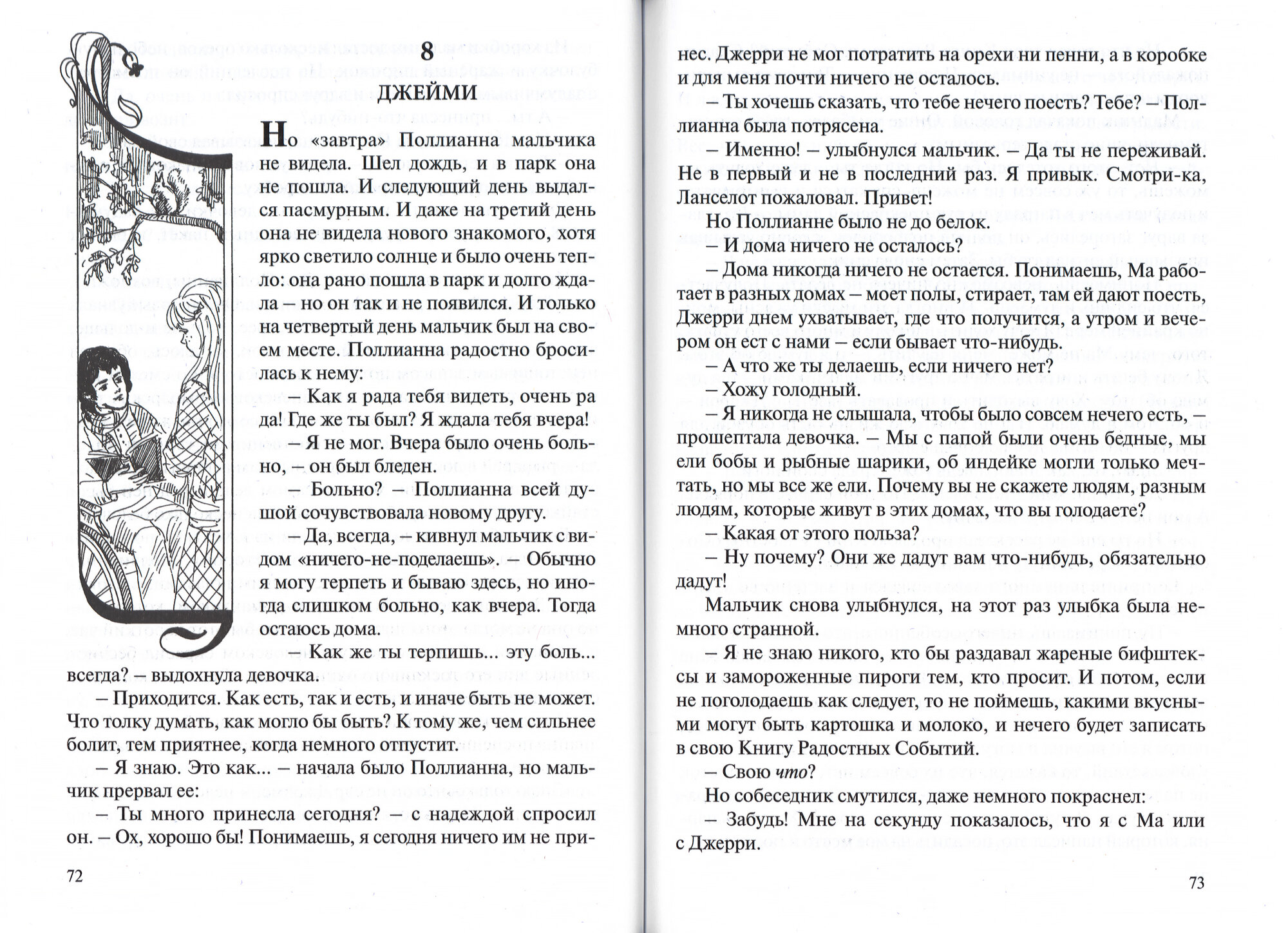 Конечно же советую тем кто еще не знаком с Поллианной прочитать первую книгу Элинор Портер. Во второй части мы видим полианну уже повзрослевшую и способную любить. Но в душе она осталась такой же маленькой девочкой продолжавшей называть свою жизнь "игрой в радость".Книга отлично напечатана, имеет множество красивых иллюстраций которые понравятся не только детям, но и подросткам. Книга замечательная.