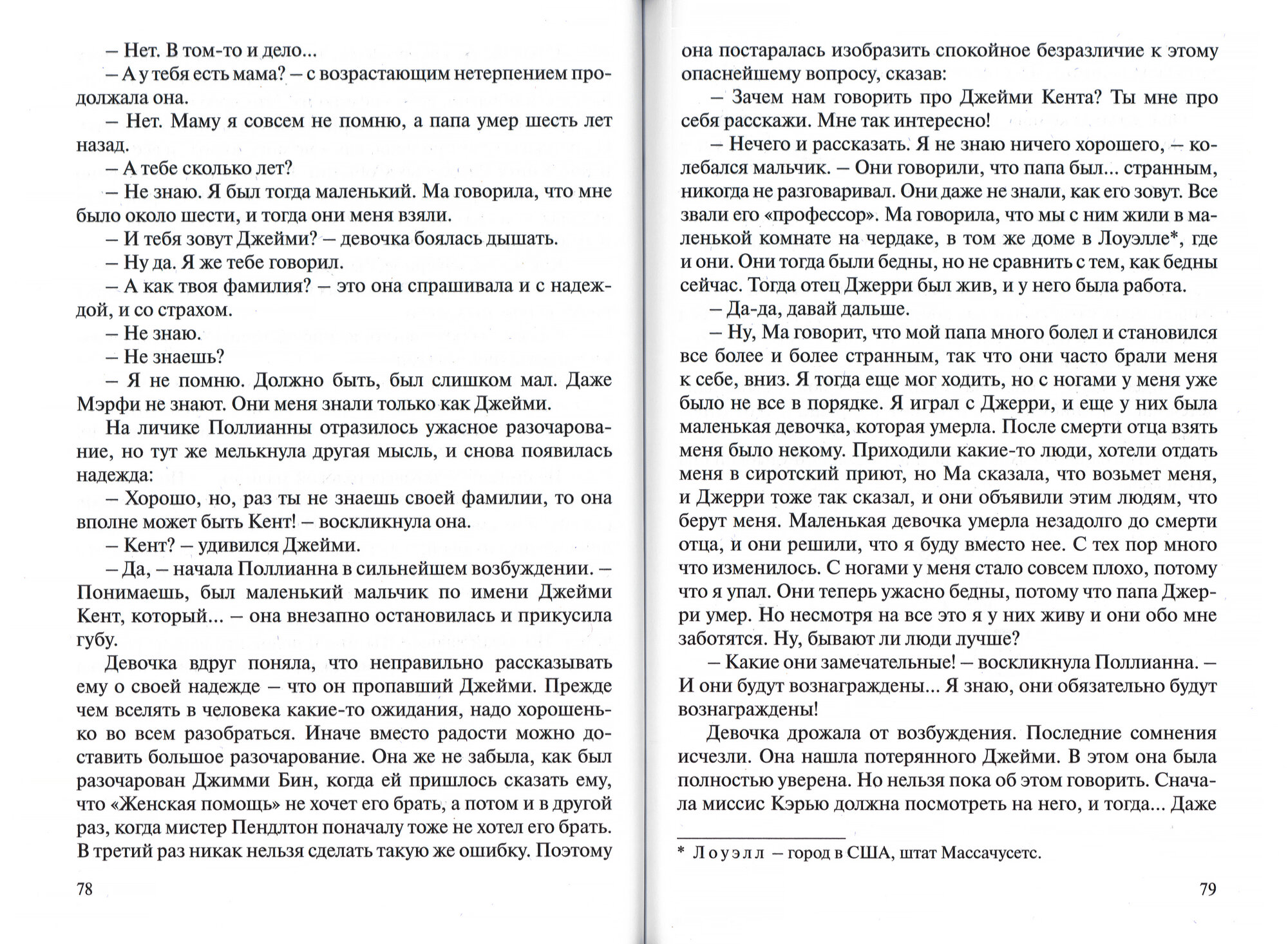 Продолжение полюбившейся читателям повести «Поллианна» - о доброй и бесхитростной девочке-сироте, которая обладает удивительным даром: она умеет при любых обстоятельствах радоваться жизни, видеть во всем лучшую сторону.