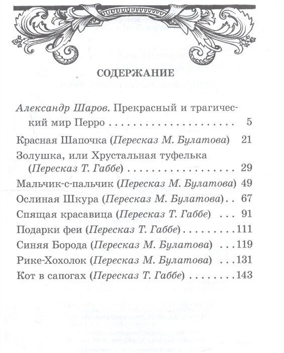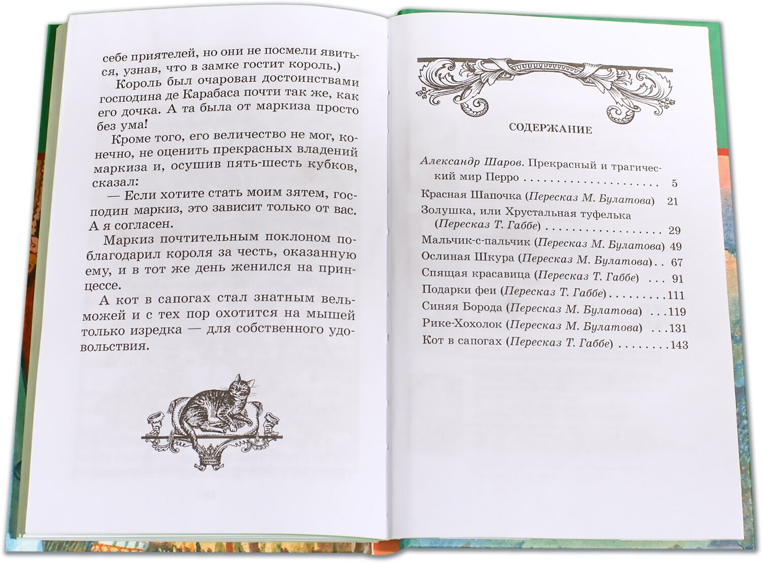 В этой книге собрано 8 сказок, о некоторых я даже и не слышала: Красная шапочка, Золушка или Хрустальная туфелька, Мальчик-с-пальчик,Ослиная шкура,Спящая красавица,Подарки феи, Синяя борода,Рике-хохолок,Кот в сапогах.Просто обалденная книга!!!За такие деньги.Шрифт крупный.Правда картинки черно-белые.В начале несколько рассказов об авторе, которые уже погружают нас в мир сказок!