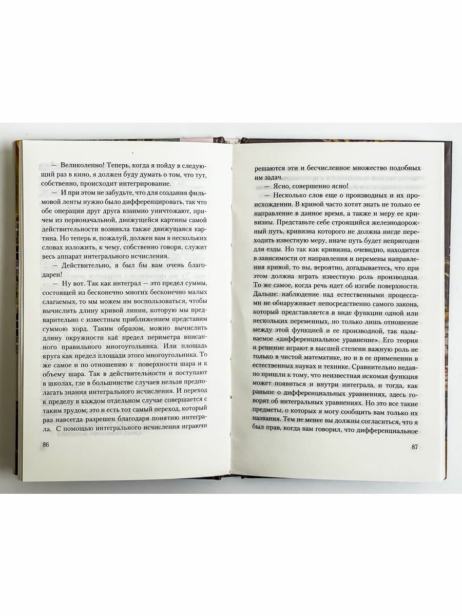 Сюжет книги: профессор математики рассказывает некоему коммерсанту о математике в целом, по его мнению, доходчиво. Вначале речь ведется о числах: натуральных, дробных, алгебраических и так далее. Добросовестно, хорошо и понятно. В объеме большем, чем это делают в школе. Про комплексные числа Вы узнаете, что с помощью одного такого числа можно определить точку на плоскости, например, здание почтамта на карте города. Вещественных чисел для этой цели, естественно, понадобится уже два. Далее идет разговор о пределах, рядах, дифференцировании и интегрировании. Раздел про интегральное исчисление, на мой взгляд, неудачен. Пример сложный, малопонятный. Возможно, там присутствуют опечатки на графике, но разбираться в них недосуг. Проективная геометрия объясняется на доступном для понимания примере: сфотографируем под небольшим углом две параллельные прямые