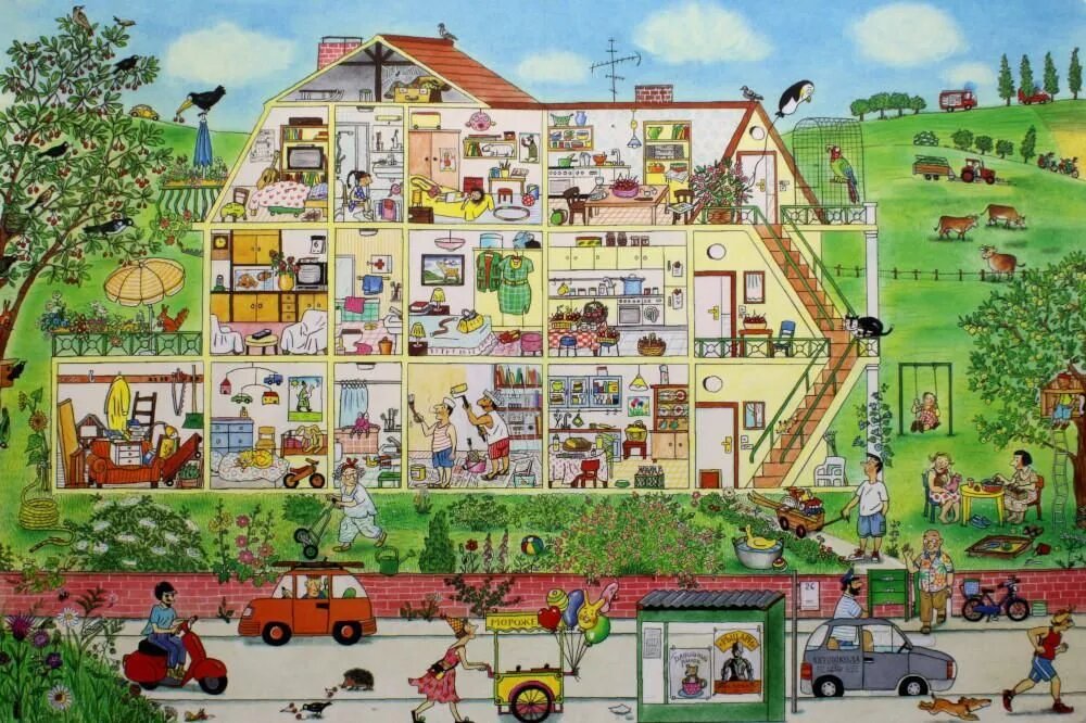 отличный виммельбух, однако отмечу, что по-настоящему ребенок сможет ее оценить, когда научится следить, что происходит с каждым героем со временем, несмотря на отсутствия текста, книга не для малышей. Мы активно используем ее для тренировки английского. Ребенок ищет кошек, собак, пожарные машины, качели, еду и великое множество самых разных вещей