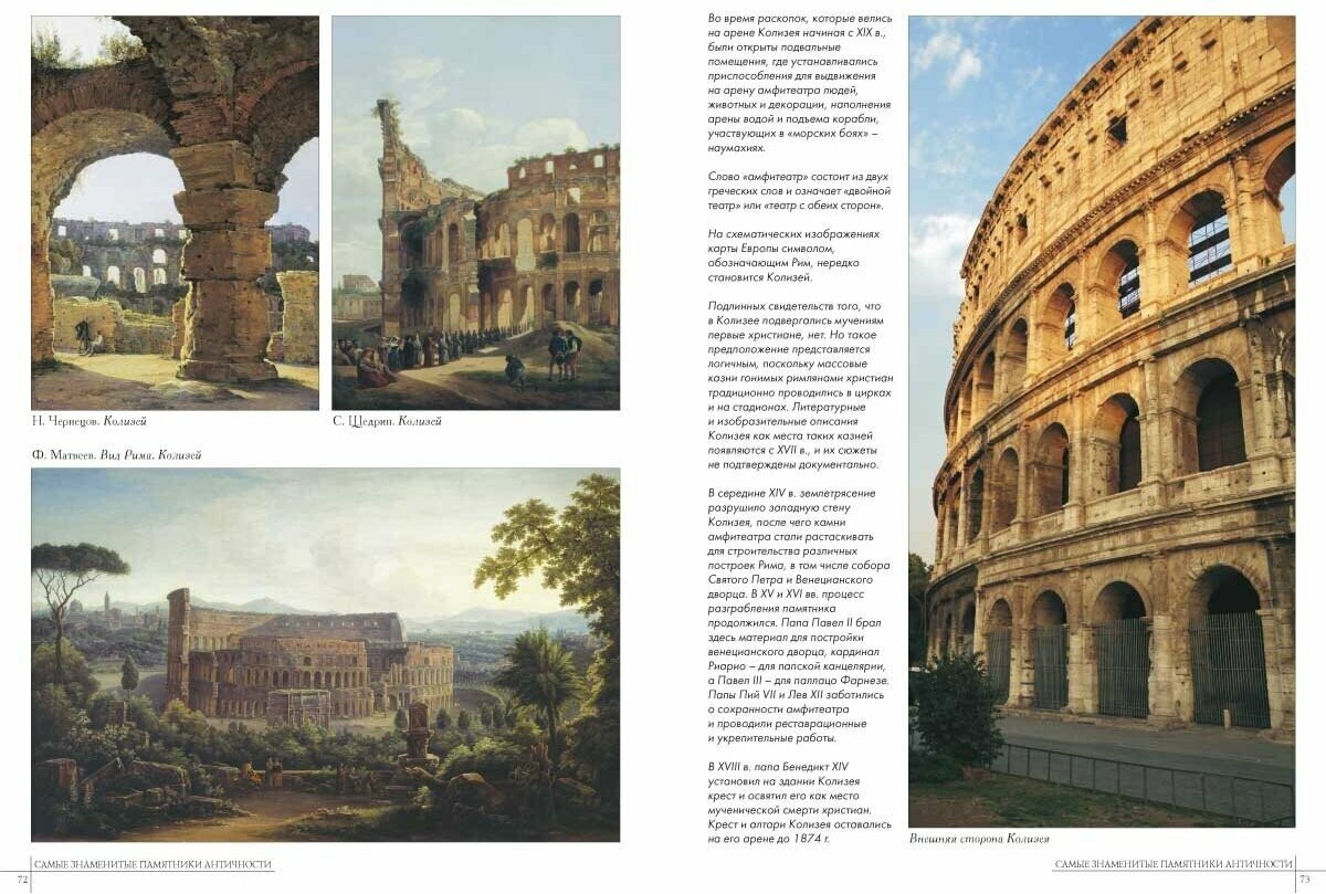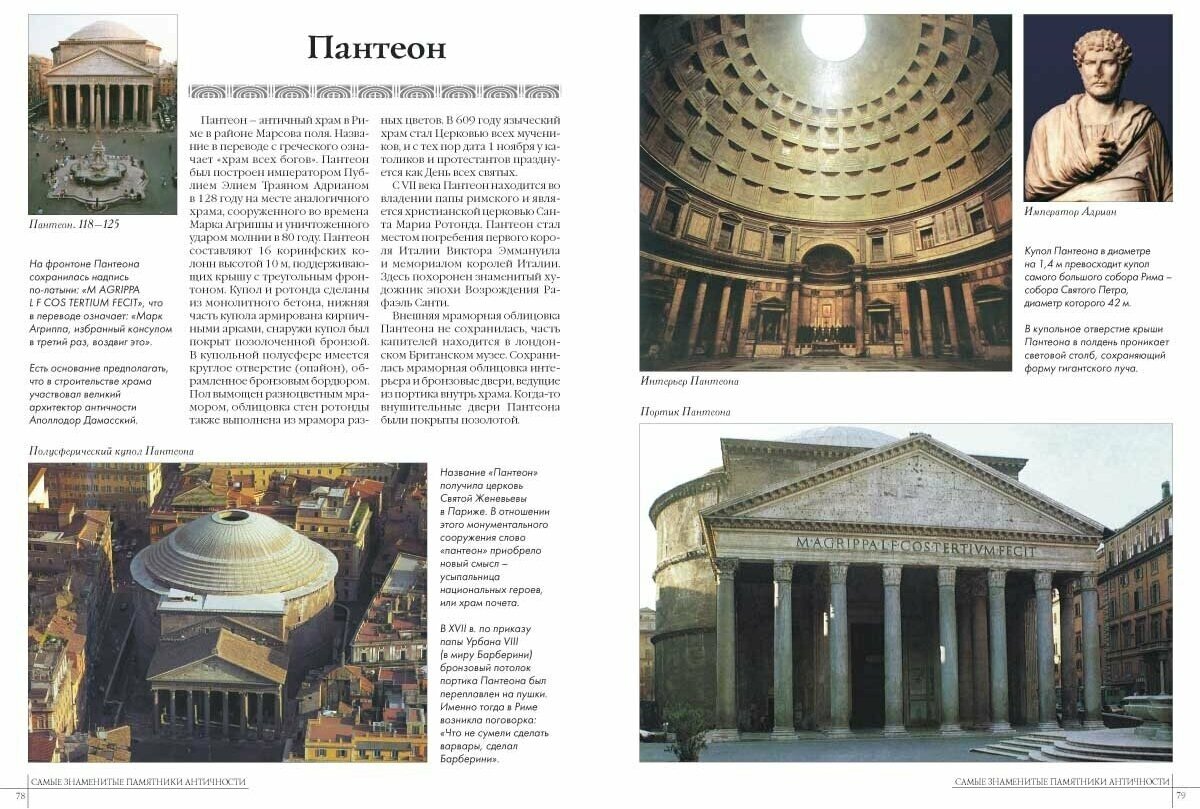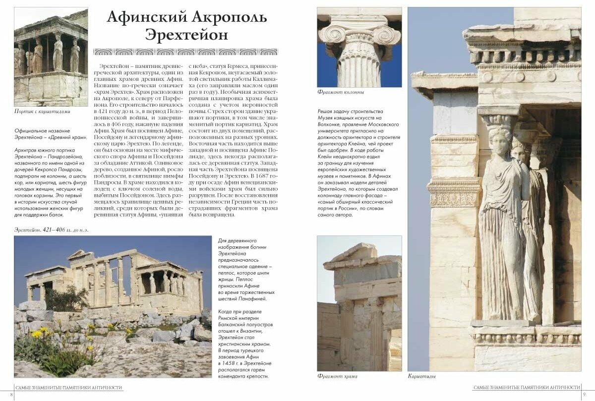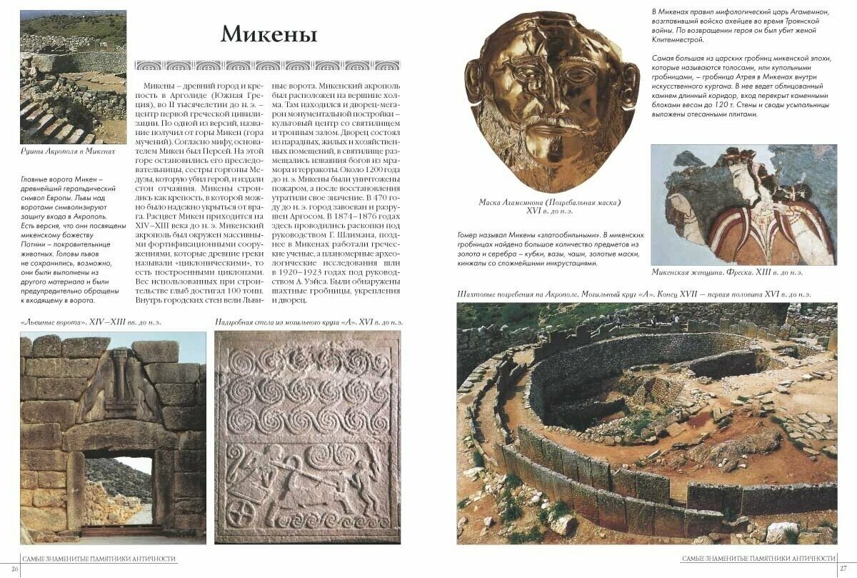 Качественное, хорошо проиллюстрированное издание, выполненное на мелованной бумаге, знакомит нас с памятниками Древней Греции и Древнего Рима. Информация подается весьма доступно и интересно, имеются курсивные сноски для выделения важной информации, множество качественных фотографий позволяют сформировать визуальное представление о величайших памятниках Античности.