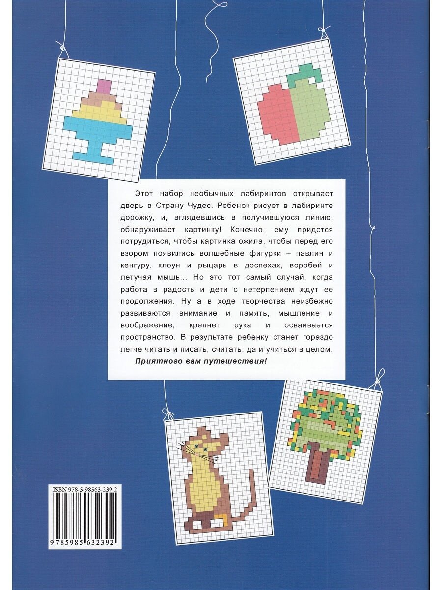 Этот набор необычных лабиринтов открывает дверь в Страну Чудес. Ребенок рисует в лабиринте дорожку, и, вглядевшись в получившуюся линию, обнаруживает картинку! Конечно, ему придется потрудиться, чтобы картинка ожила, чтобы перед его взором появились волшебные фигурки - павлин и кенгуру, клоун и рыцарь в доспехах, воробей и летучая мышь... Но это тот самый случай, когда работа в радость и дети с нетерпением ждут ее продолжения. Ну а в ходе творчества неизбежно развиваются внимание и память, мышление и воображение, крепнет рука и осваивается пространство. В результате ребенку станет гораздо легче читать и писать, считать, да и учиться в целом.