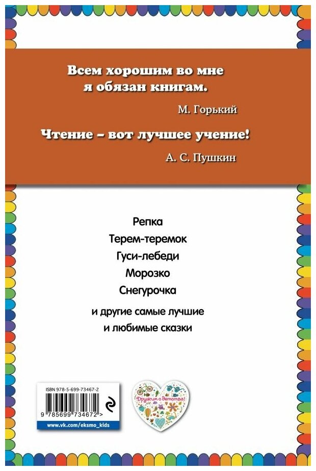 Книга не для самых маленьких, т.к. кроме репки, теремка, гусей-лебедей, волка и козляток остальные сказки не такие распространенные. -