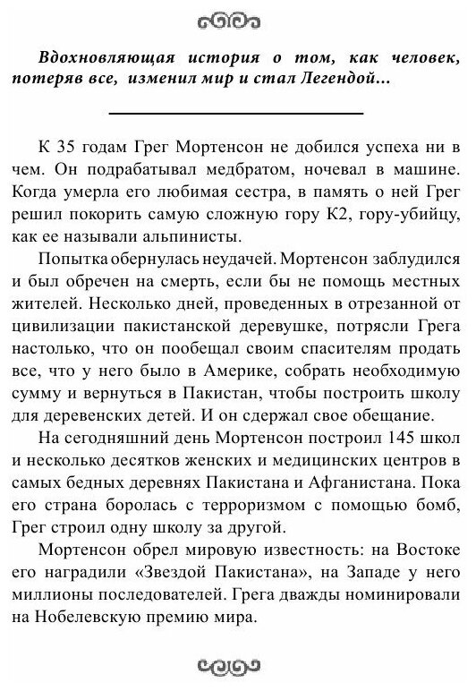 "Три чашки чая" - это поразительная история о том, как самый обычный человек, не обладая ничем кроме решительности, способен в одиночку изменить мир.