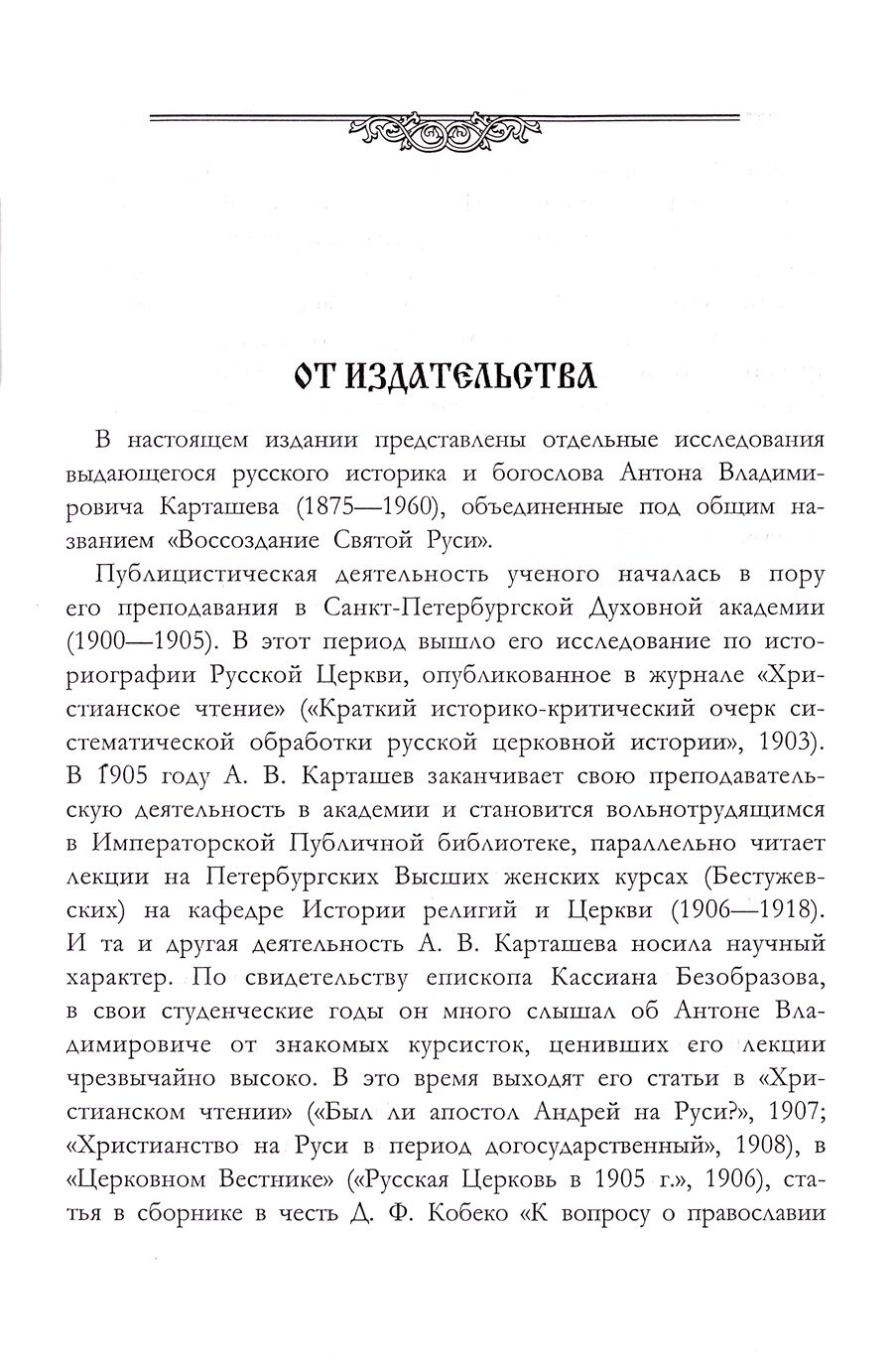 Книга "Воссоздание Святой Руси" - подлинный шедевр христианского историософского мышления. В ней автор обобщил многое из того, что было написано по этой теме его предшественниками. Главное место в воссоздании Святой Руси Карташев отводил Церкви и правовой христианской государственности. Как полагал мыслитель, государство должно быть пропитано христианским мировоззрением. Философ представил свой взгляд на византийскую теорию симфонии государственной и церковной власти, а также сформулировал идею необходимости друг для друга Третьего Рима и Святой Руси. Настоящее издание адресовано всем тем, кто интересуется историей религии и Церкви, а также вопросами русской религиозно-философской мысли.
