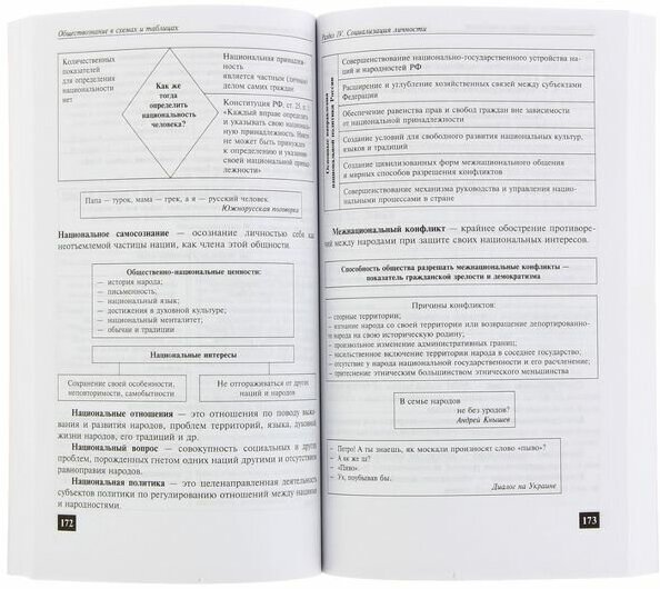 Схем и таблиц в пособии много, разнообразных и очень информативных. Кроме того здесь же имеются основные понятия по предмету и даже высказывая по теме различных известных личностей.