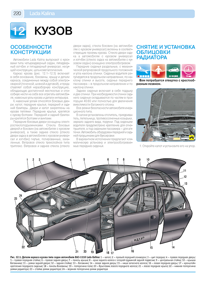 Предлагаем вашему вниманию руководство по ремонту и эксплуатации с каталогом деталей легковых автомобилей семейства Lada Kalina с кузовами типа хэтчбек, седан и универсал, с бензиновыми двигателями ВАЗ-21114-50 (1,6 л), ВАЗ-21126 (1,6 л) и ВАЗ-11194 (1,4 л).