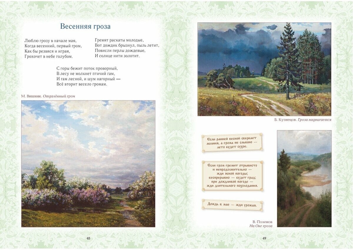 В книге собраны стихи русских поэтов о природе, пословицы и поговорки русского народа, приметы и наблюдения о том, как она меняется в разное время года. Сборник украсили картины русских художников. Книгу можно использовать на уроках литературы. Книга составлена с учетом требований программы по литературе, поэтому будет полезна преподавателям и школьникам младших классов, а также учителям литературы средней школы.