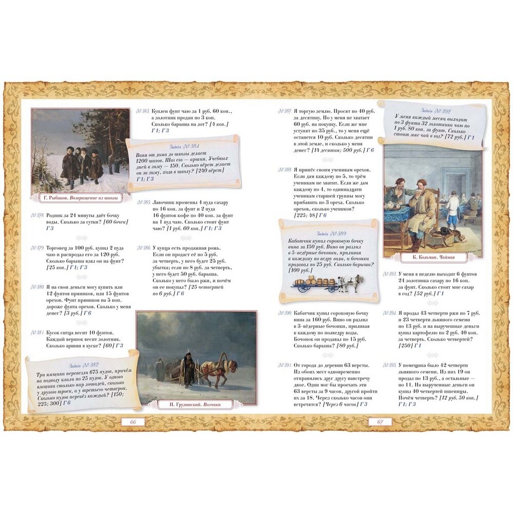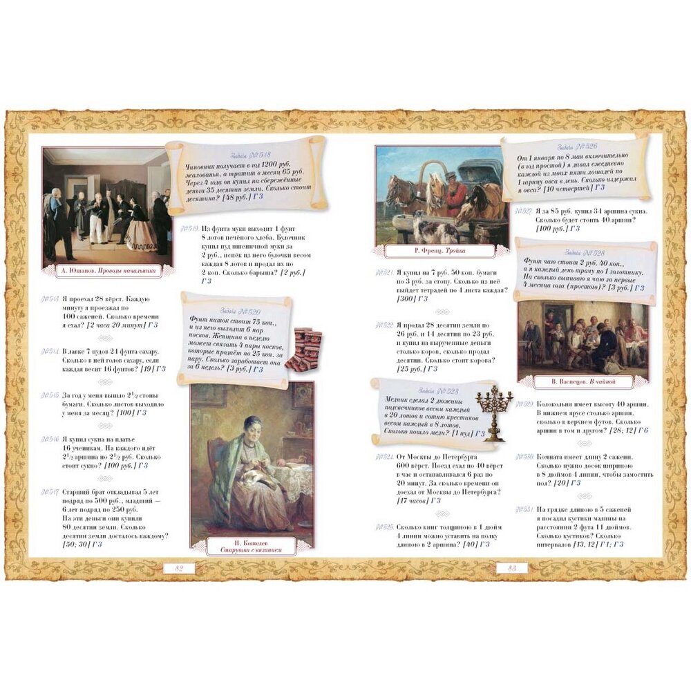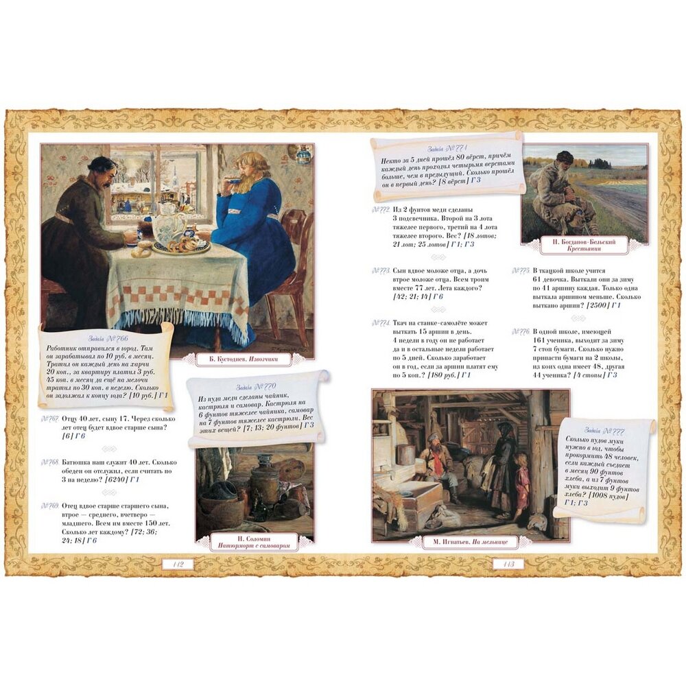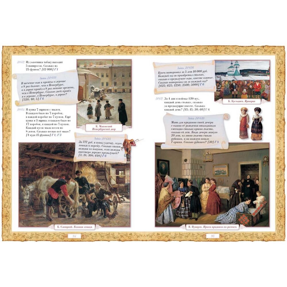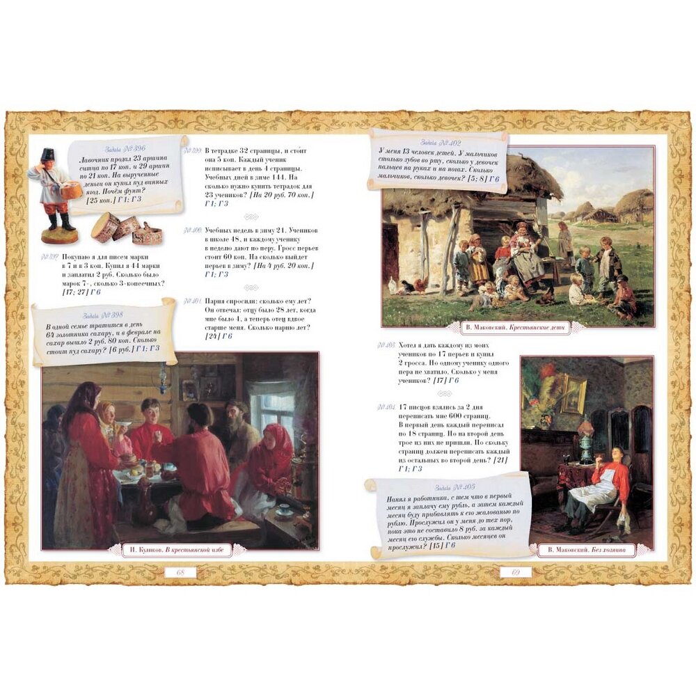 Об оформлении. Книга, безусловно, уникальна. Большой формат, твердый переплет, плотная бумага, хорошее качество печати. Прекрасно изданный задачник известного педагога, проиллюстрированный картинами русских художников, становится еще и учебником русского быта. Текст обрамлен узорчатой рамочкой, тонированной под старинную бумагу. На каждой странице несколько иллюстраций, благодаря которым мы побываем в крестьянской избе и в купеческом доме, станем свидетелями детских игр и пересчета приданого, увидим, как трудились и отдыхали наши предки. Рассматривать книгу можно бесконечно. Оформление завораживает. А вот содержание… Не стоит забывать, что задачник составлен больше ста лет назад. Любители редких и необычных книг будут в восторге. А вот стоит ли покупать ее в расчете на современного школьника?... Разве что особо увлеченному руководителю математического кружка.