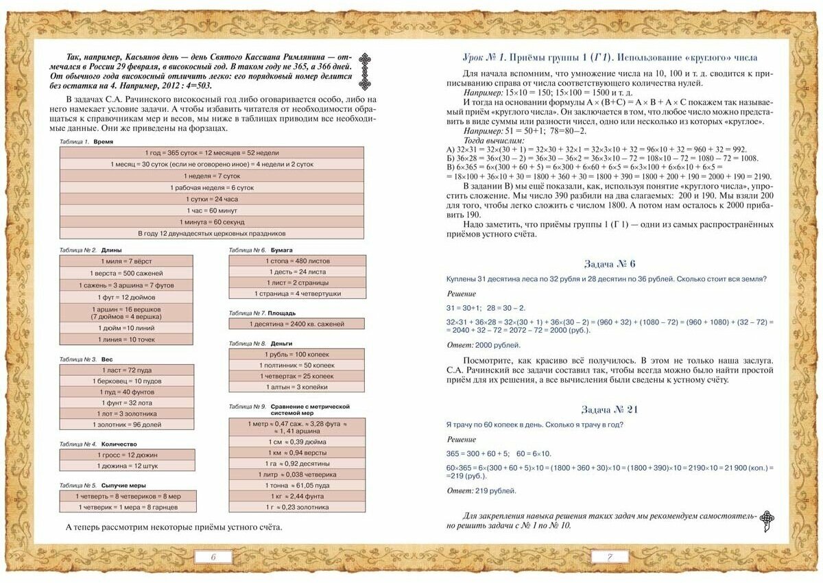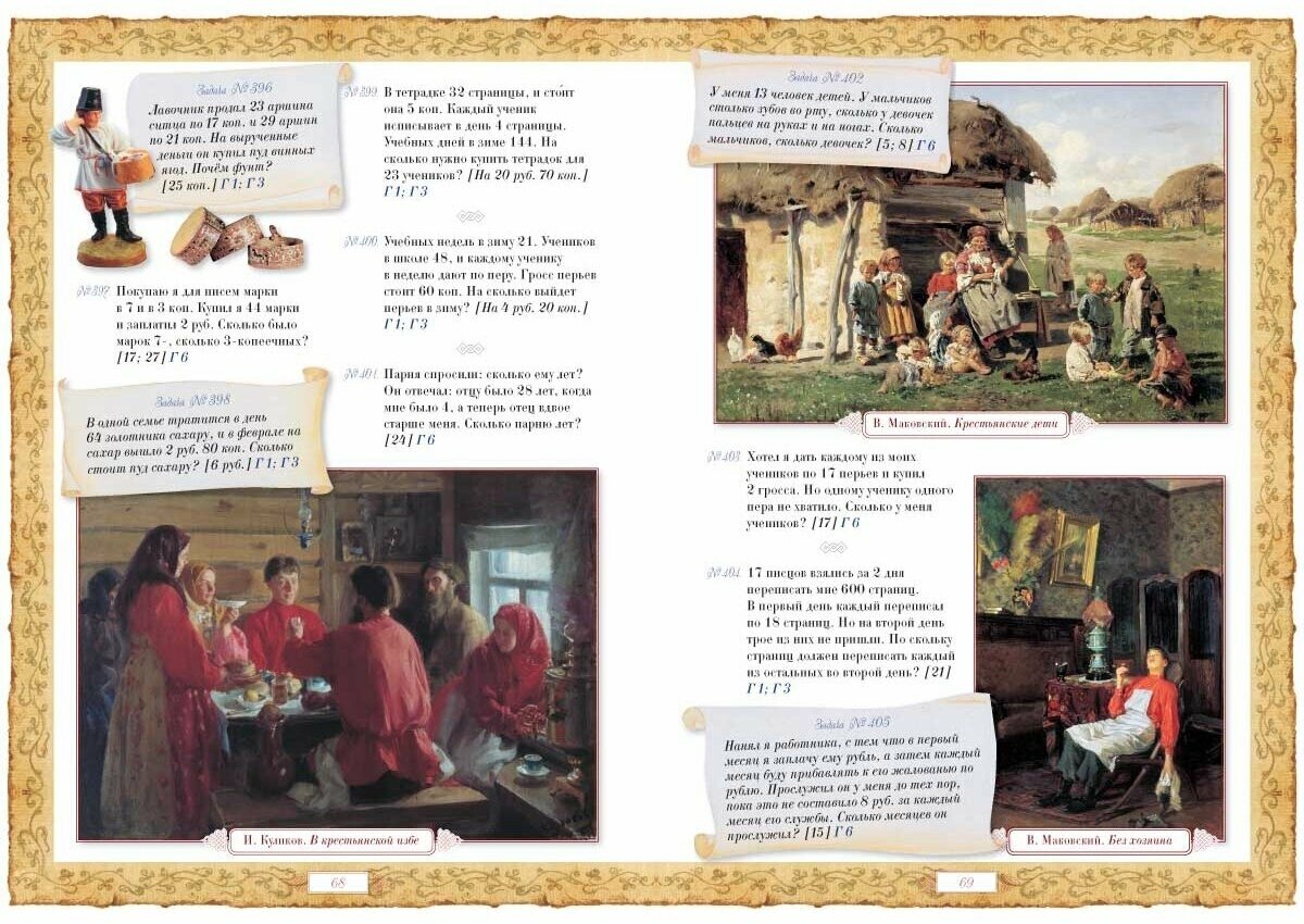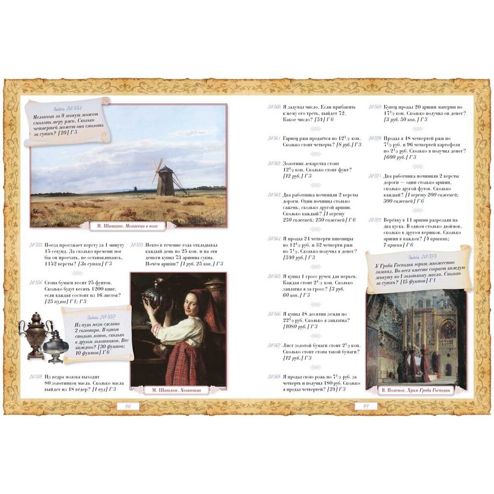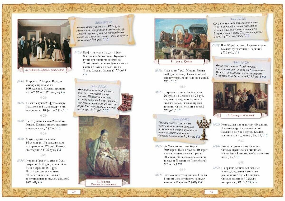 Об оформлении. Книга, безусловно, уникальна. Большой формат, твердый переплет, плотная бумага, хорошее качество печати. Прекрасно изданный задачник известного педагога, проиллюстрированный картинами русских художников, становится еще и учебником русского быта. Текст обрамлен узорчатой рамочкой, тонированной под старинную бумагу. На каждой странице несколько иллюстраций, благодаря которым мы побываем в крестьянской избе и в купеческом доме, станем свидетелями детских игр и пересчета приданого, увидим, как трудились и отдыхали наши предки. Рассматривать книгу можно бесконечно. Оформление завораживает. А вот содержание… Не стоит забывать, что задачник составлен больше ста лет назад. Любители редких и необычных книг будут в восторге. А вот стоит ли покупать ее в расчете на современного школьника?... Разве что особо увлеченному руководителю математического кружка.