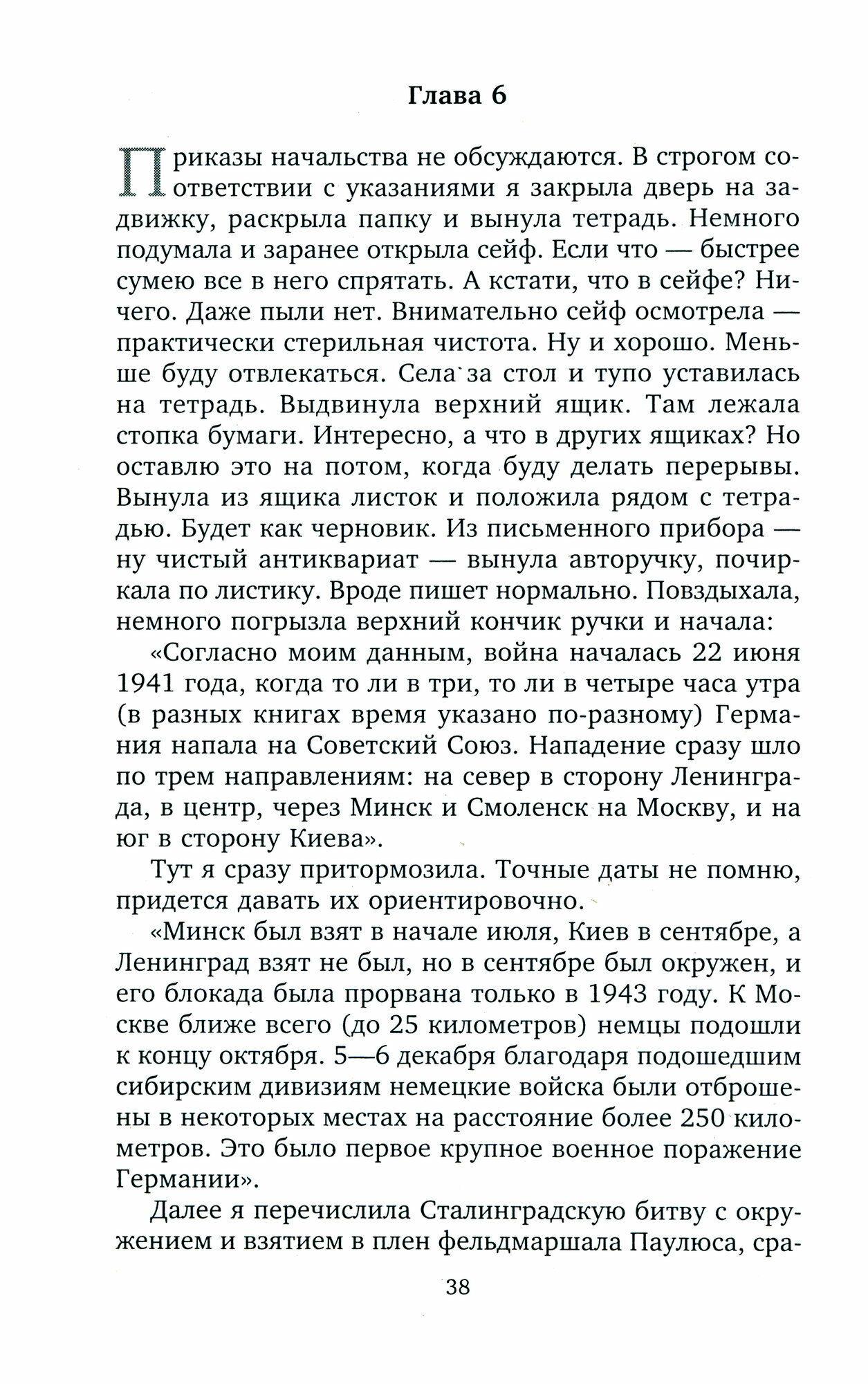 Бред...Первая книга была получше, по крайней мере не хватался за голову по 3 раза за главу, как во второй. Очень простой язык, легко читается... Но читать эту книгу можно только как фэнтези и ни в коем случае не читать людям более менее знакомым с историей ВОВ. Куда то пропала всезнающая ГГ , теперь она и элементарных вещей из истории не знает, не помнит. Зато есть умненький папа – Лаврентий Палыч и добренький дедушка Сталин. Они ГГ сразу полюбили и ни кому в обиду не дадут. Вообщем – простая до убогости сказка. Интриг нет, все ясно и понятно, но еще раз повторюсь – людям , знающим историю ВОВ и СССР, читать не рекомендую.